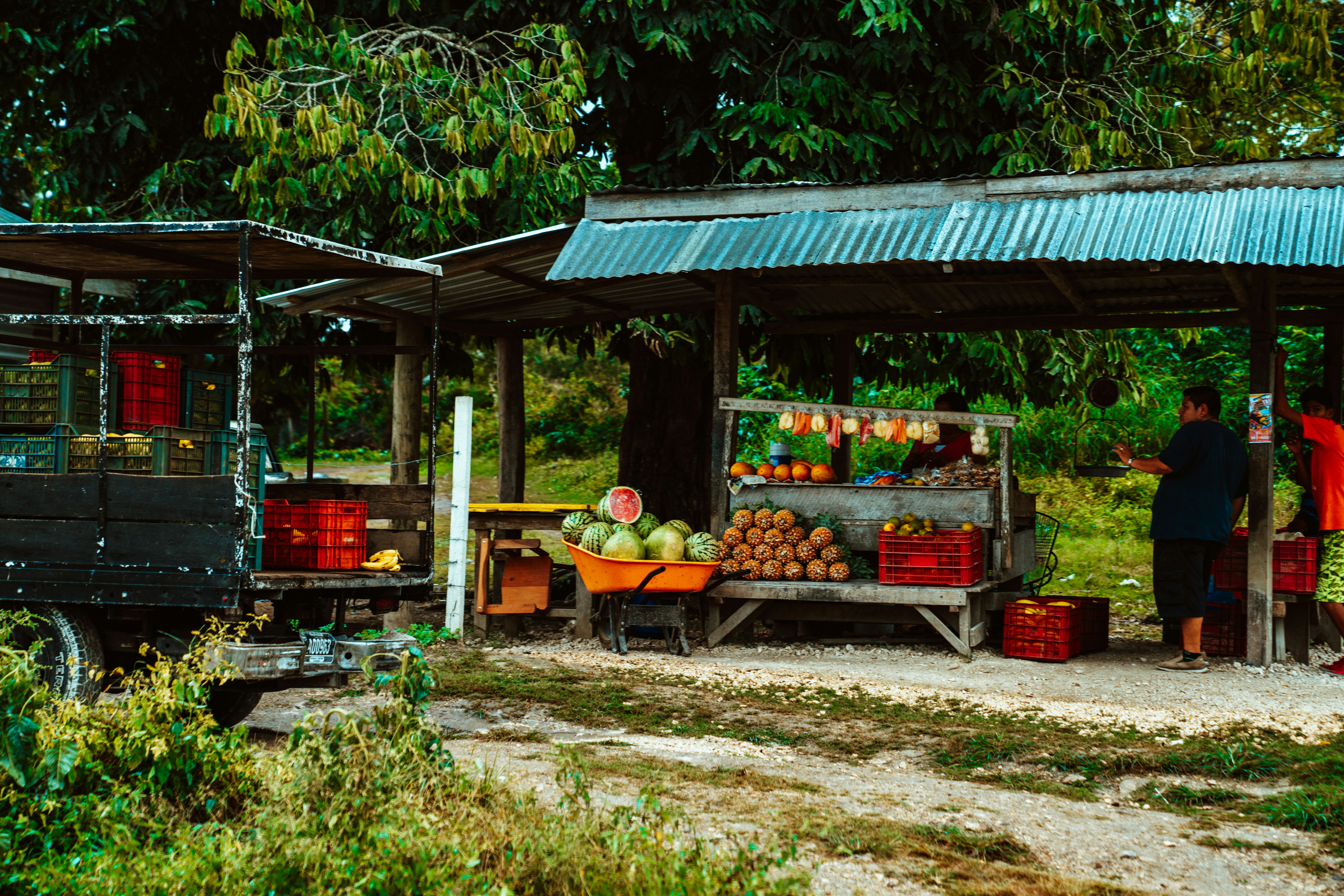 fruits on brown wooden table under blue canopy tent during daytime belize google meet background