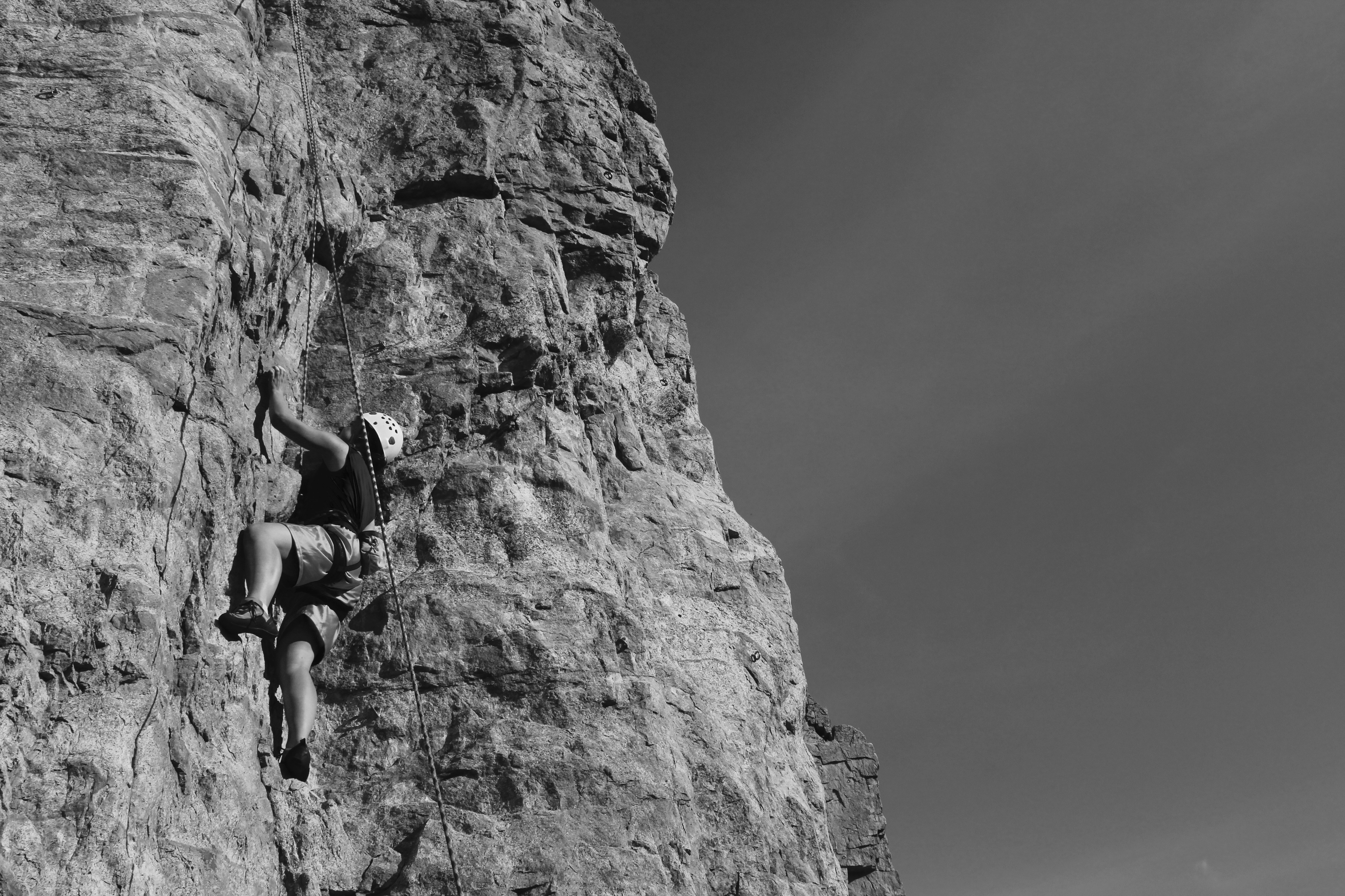 10. Grayscale Photography Of Man Climbing Rock Adventurous Teams Background