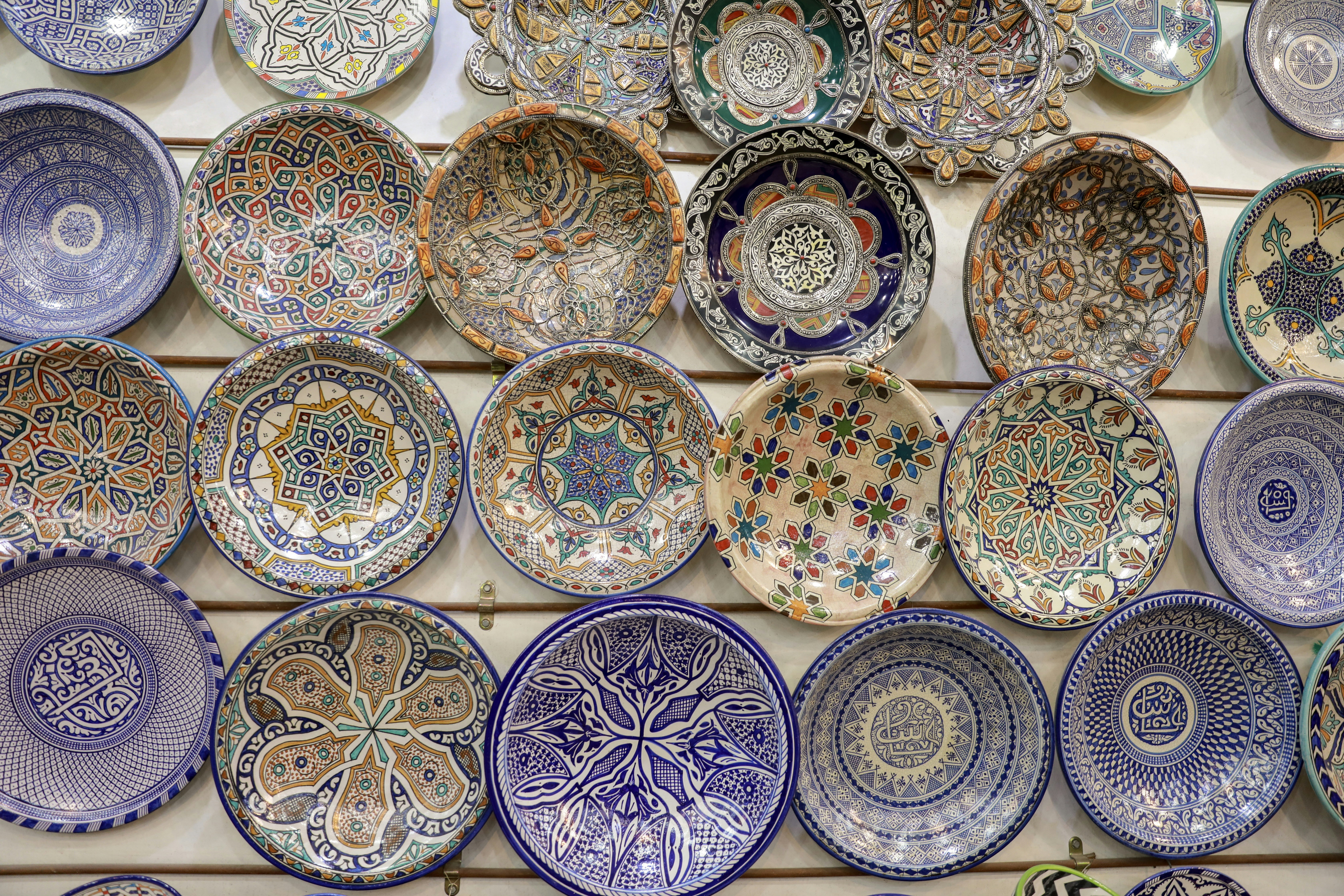 assorted color ceramic decorative plates lot art noveau teams background