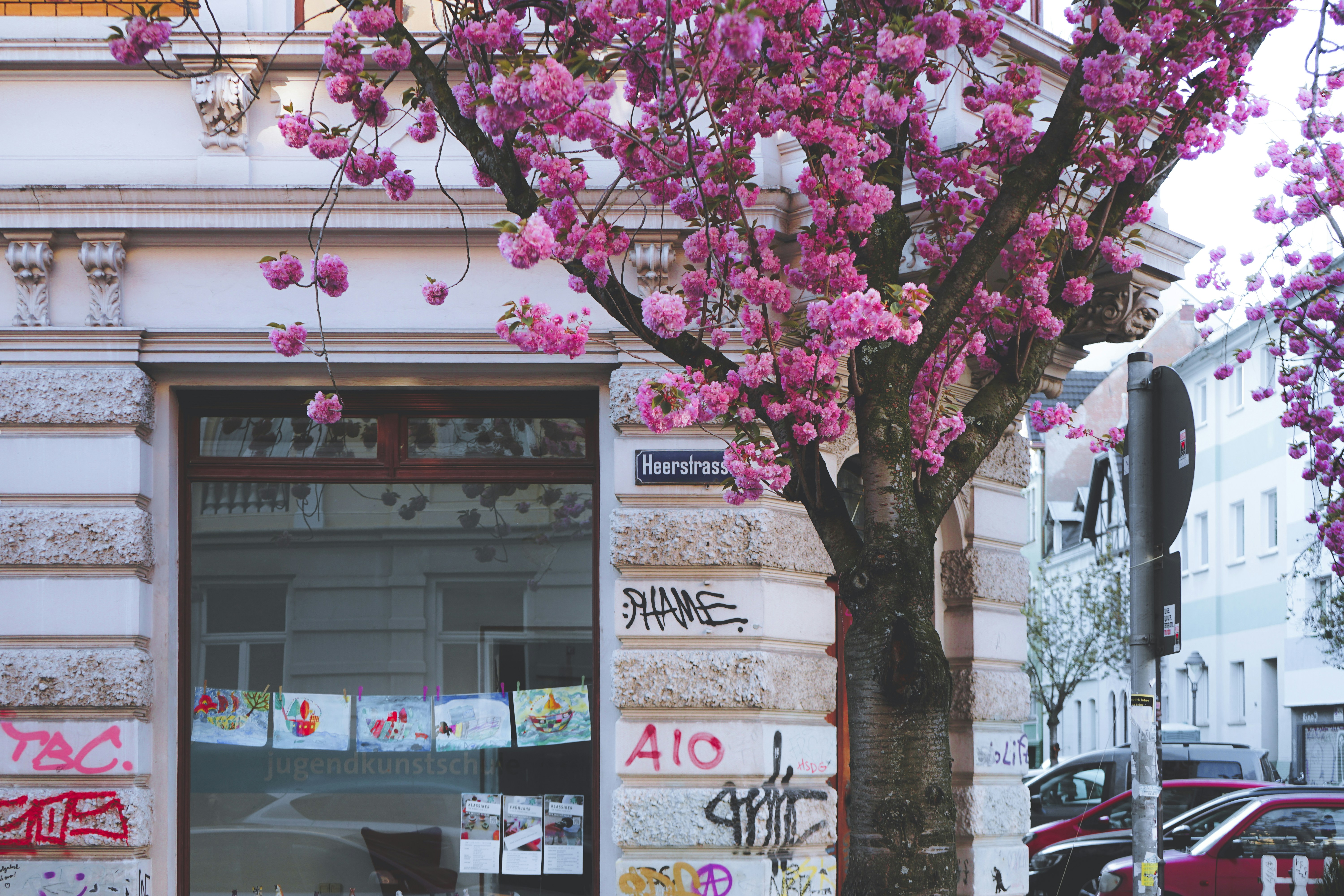 purple and white flowers on tree art noveau teams background