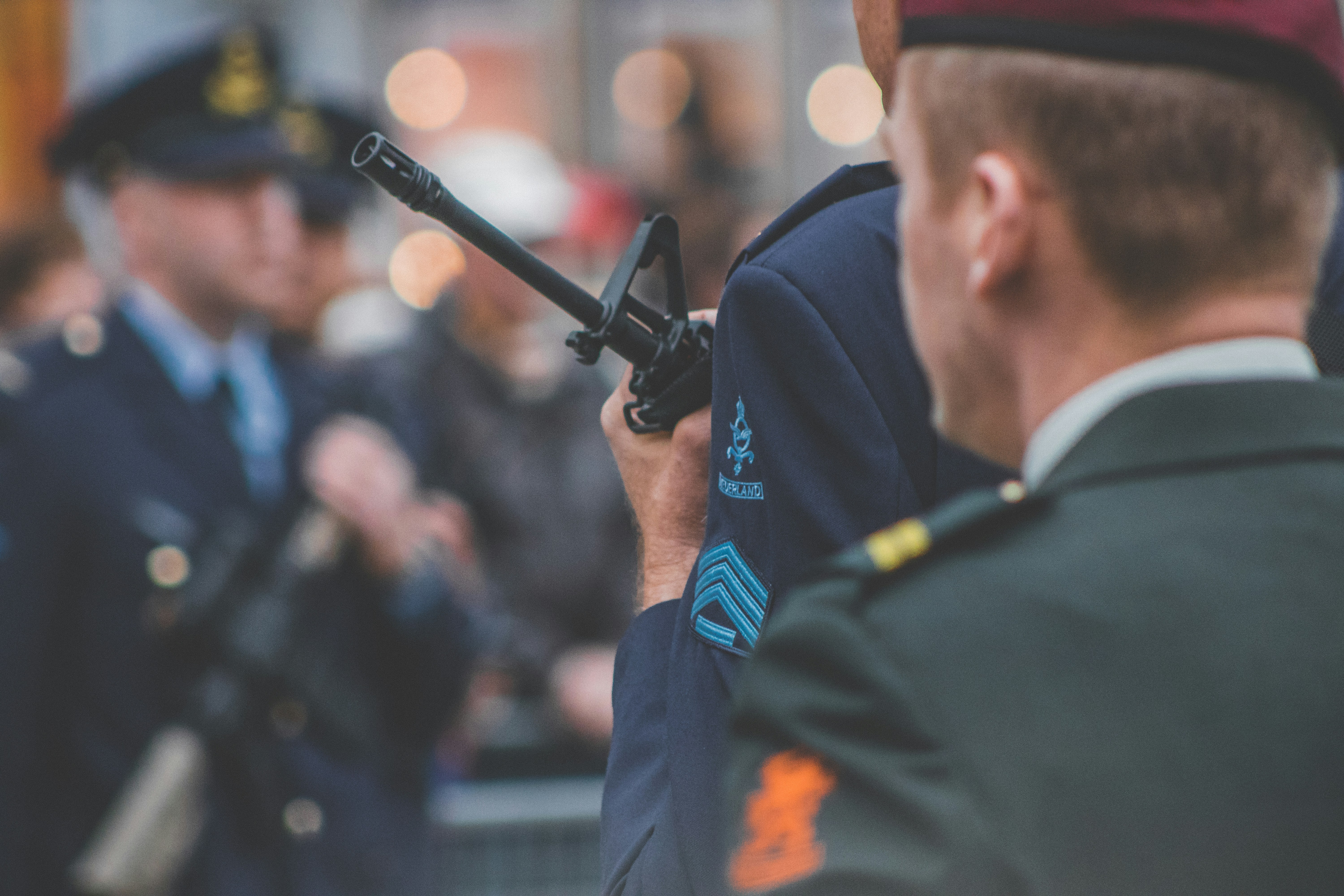 1. Shallow Depth Of Field Photo Of Man Holding Rifle Bagpipe Teams Background
