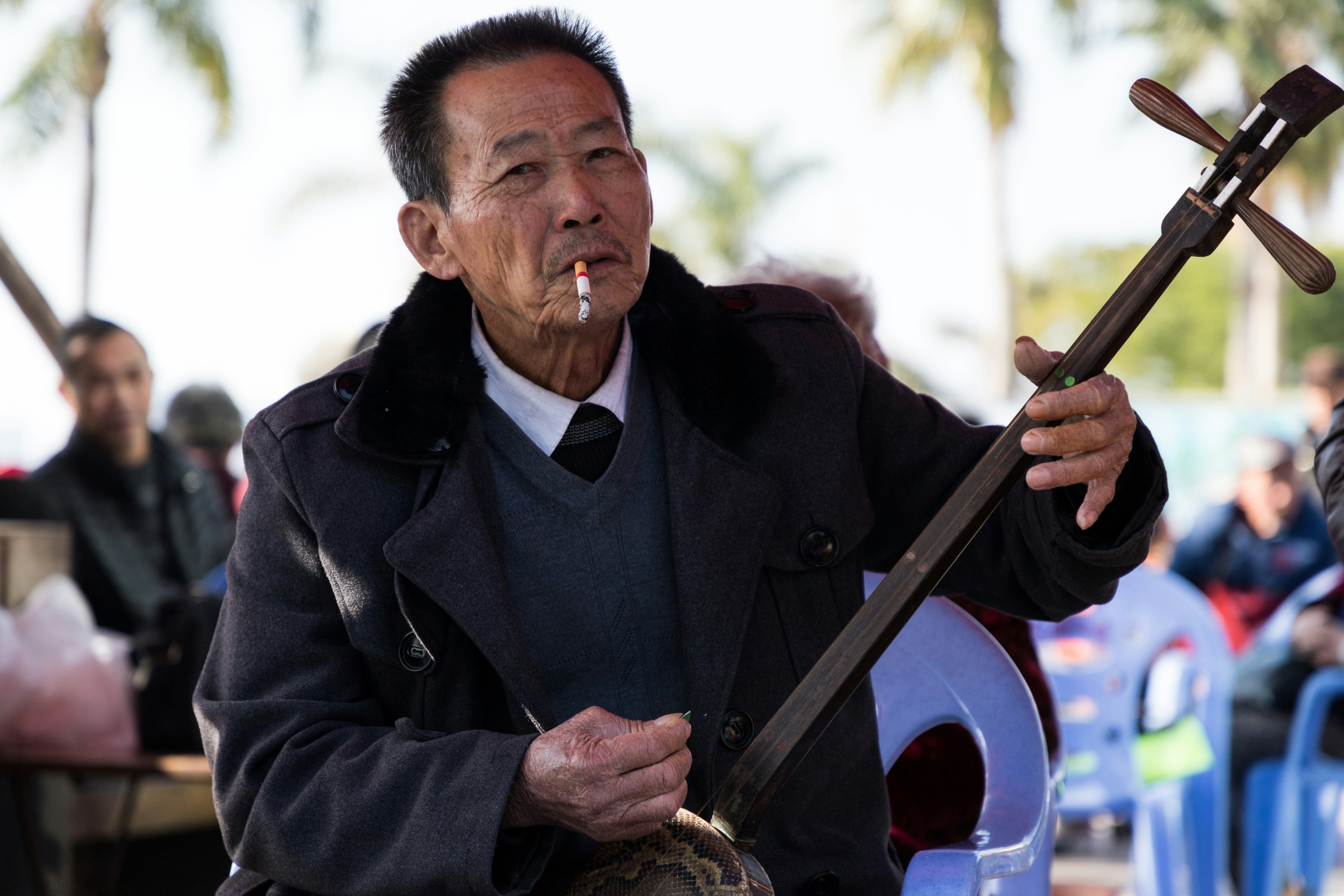 8. Man Wearing Black Suit Holding Guitar While Smoking Bagpipe Teams Background