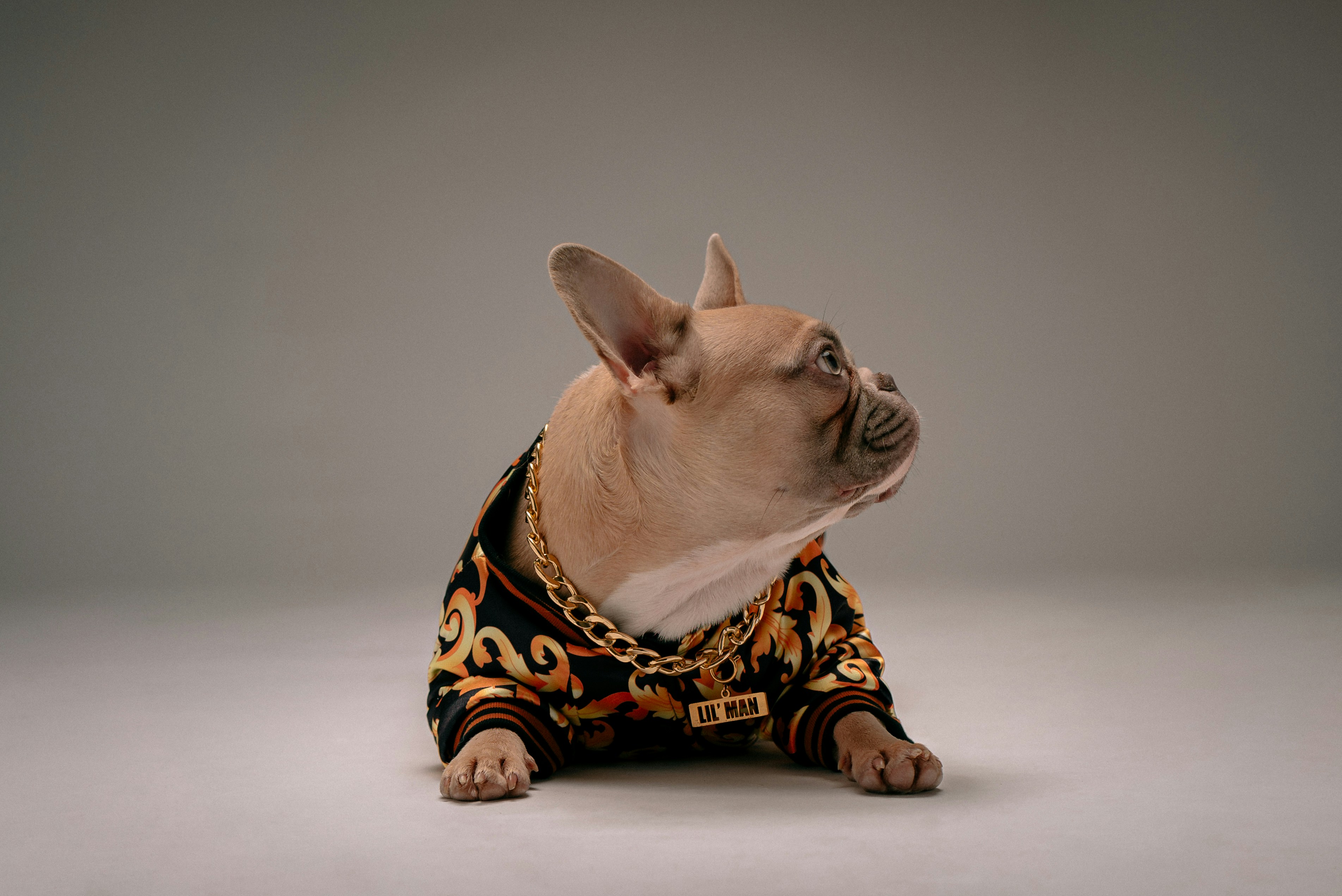 4. Brown And White Pug Wearing Black And Yellow Leopard Print Coat Canine Teams Background