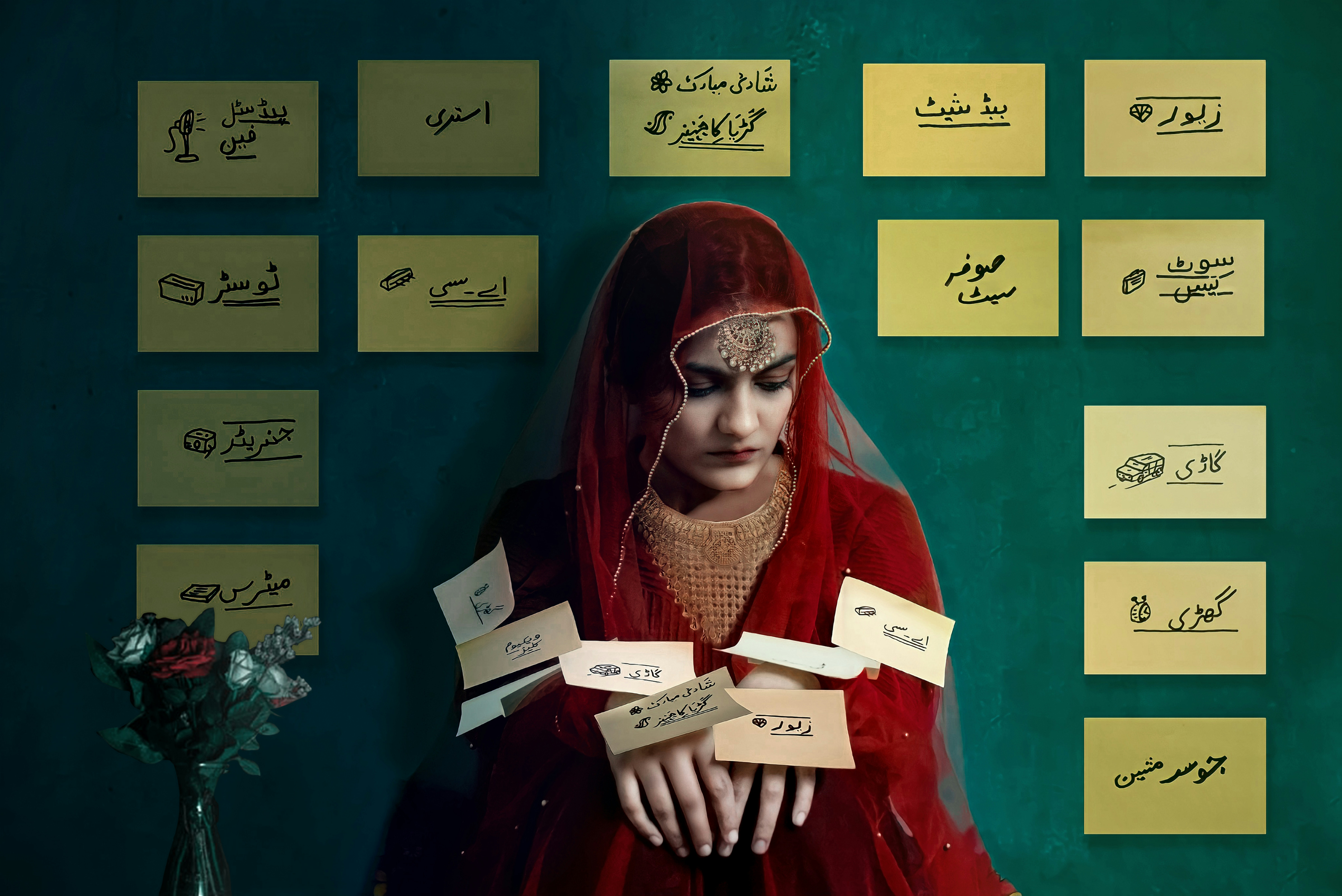 6. Woman In Red And Black Coat Holding White And Red Cards Conceptual Art Teams Background