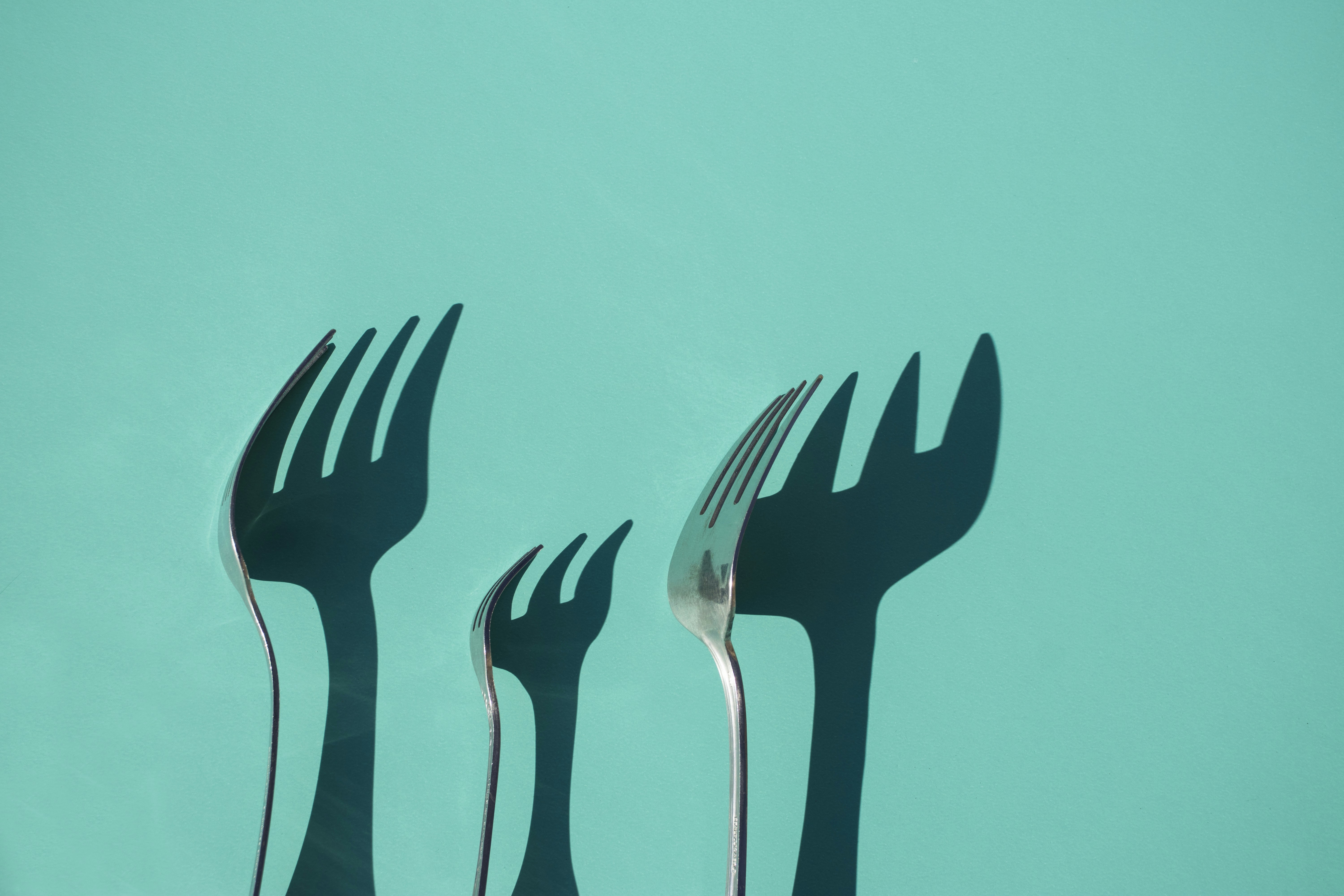 8. Three Gray Metal Forks Casting Shadow On Green Surface Contemporary Teams Background