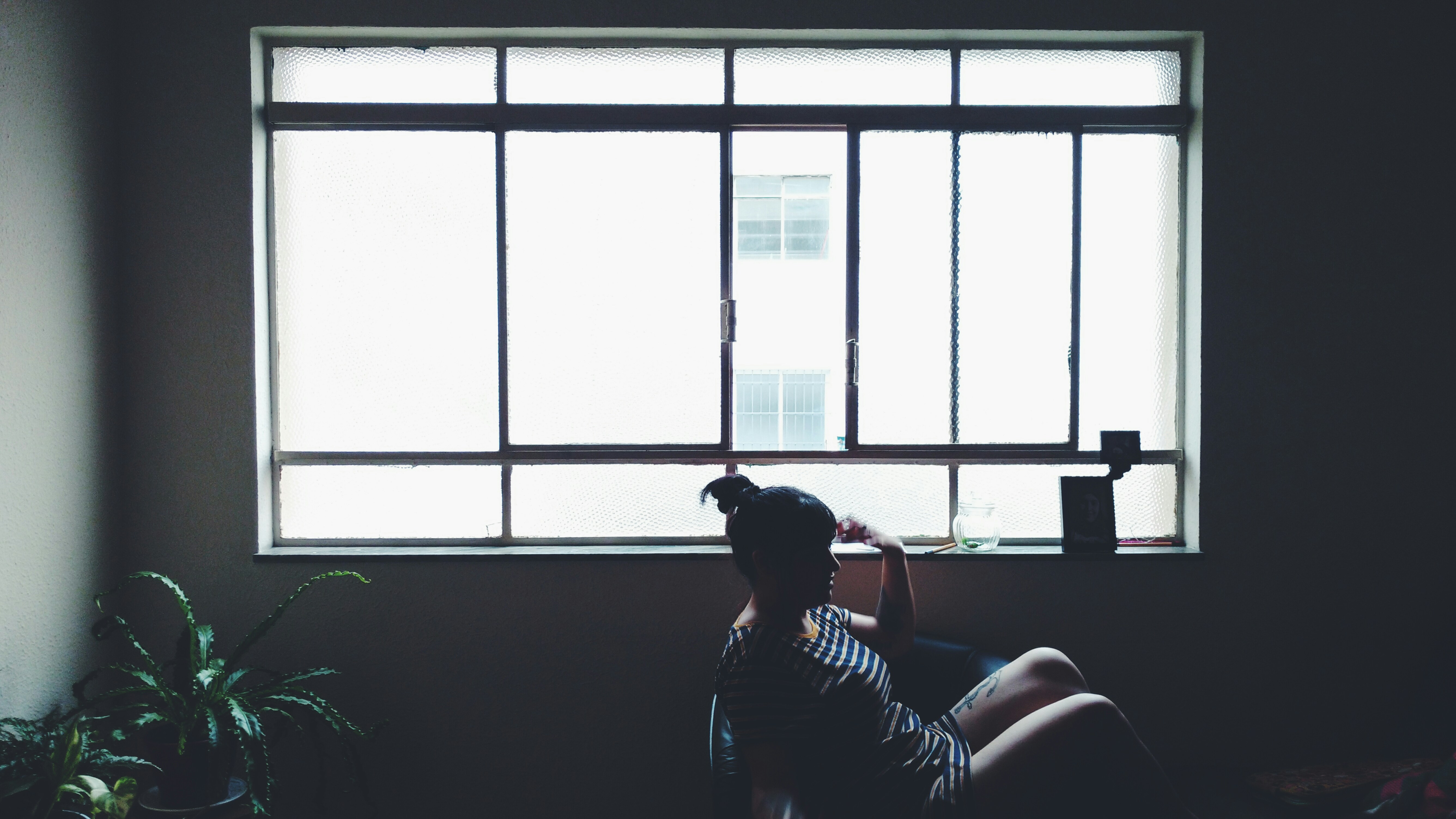 5. Woman Sitting On Chair Beside Glass Window Near Plant Cubism Teams Background