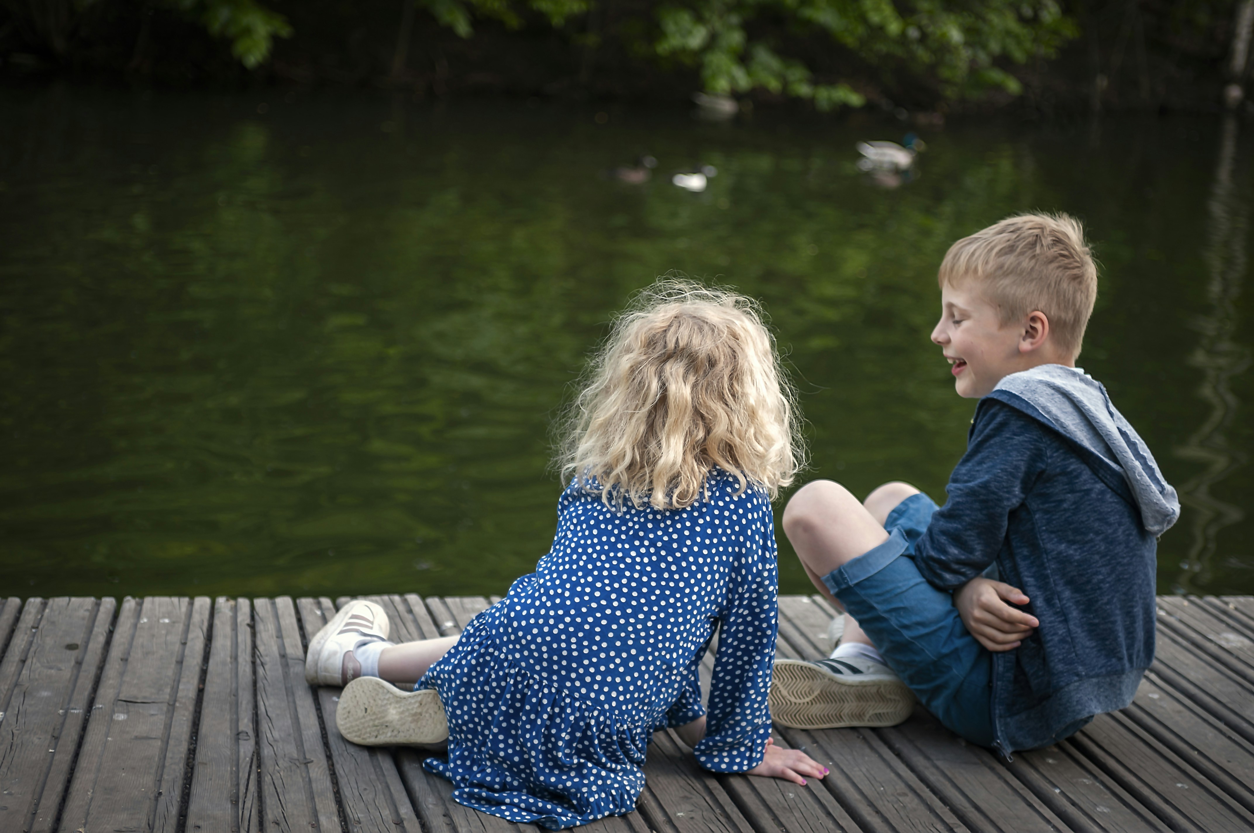 girl in blue and white floral dress sitting on brown wooden dock during daytime delightful teams background