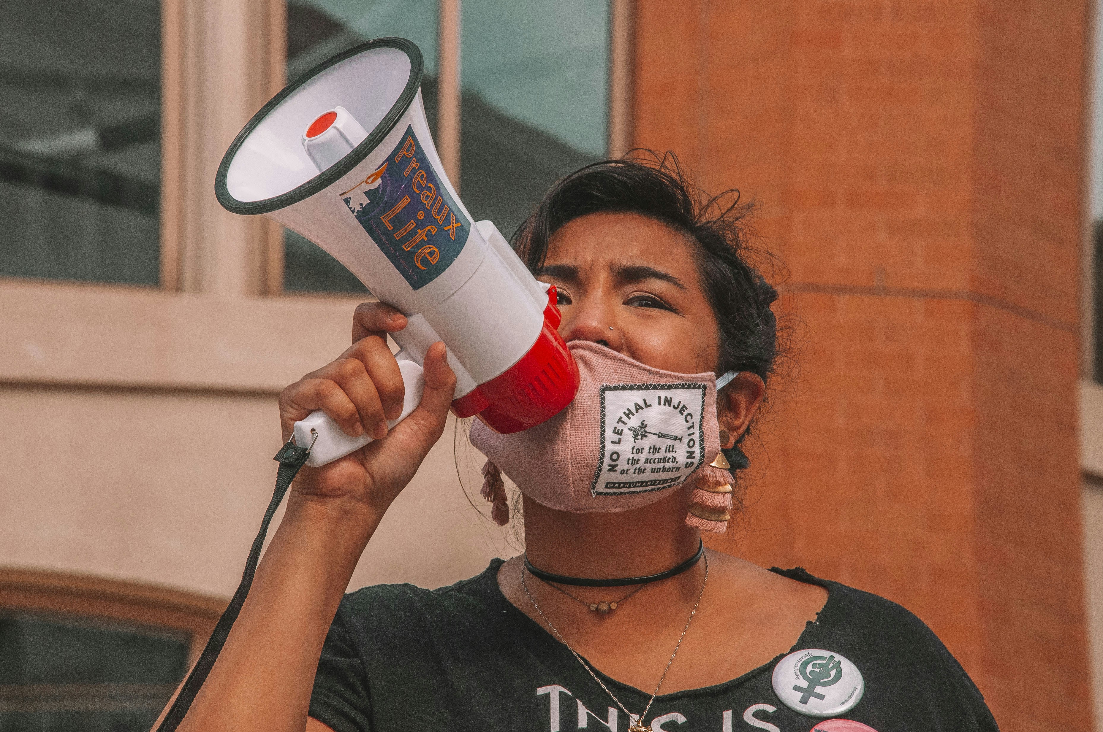 woman in black crew neck shirt holding white and red disposable cup democrat teams background