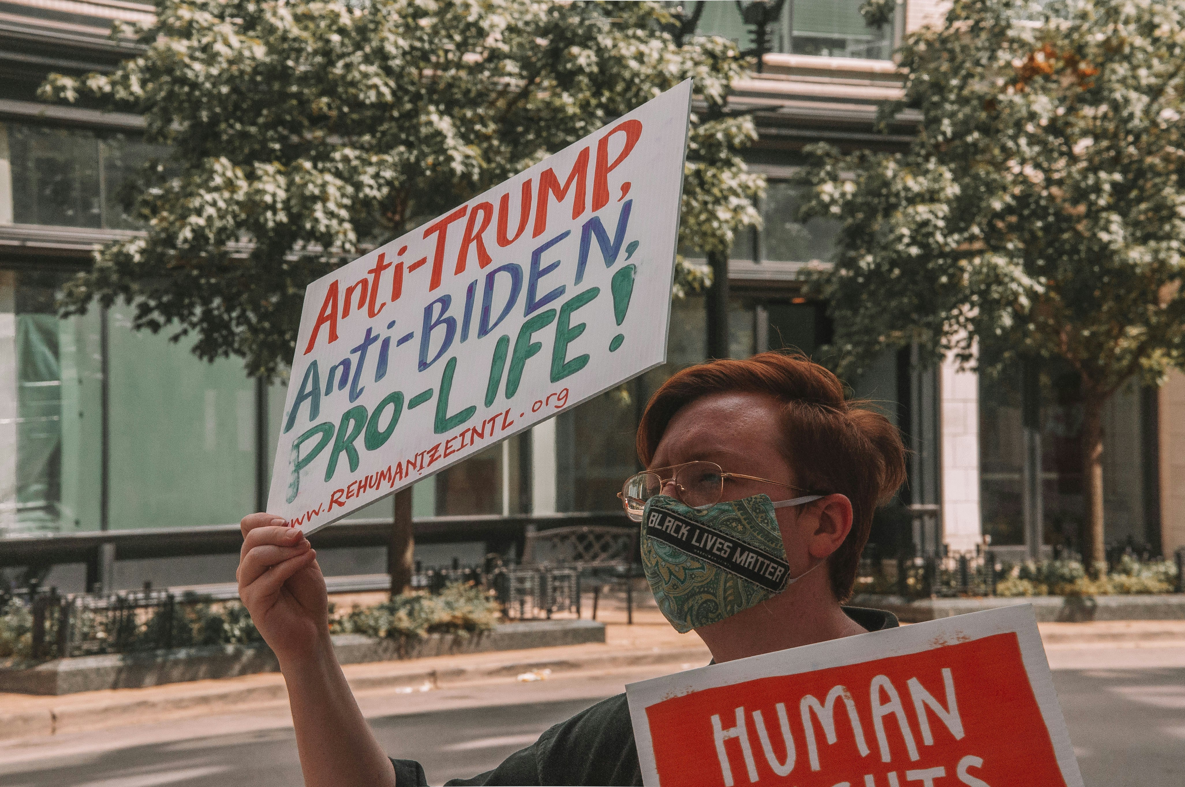 woman raise signage democrat teams background