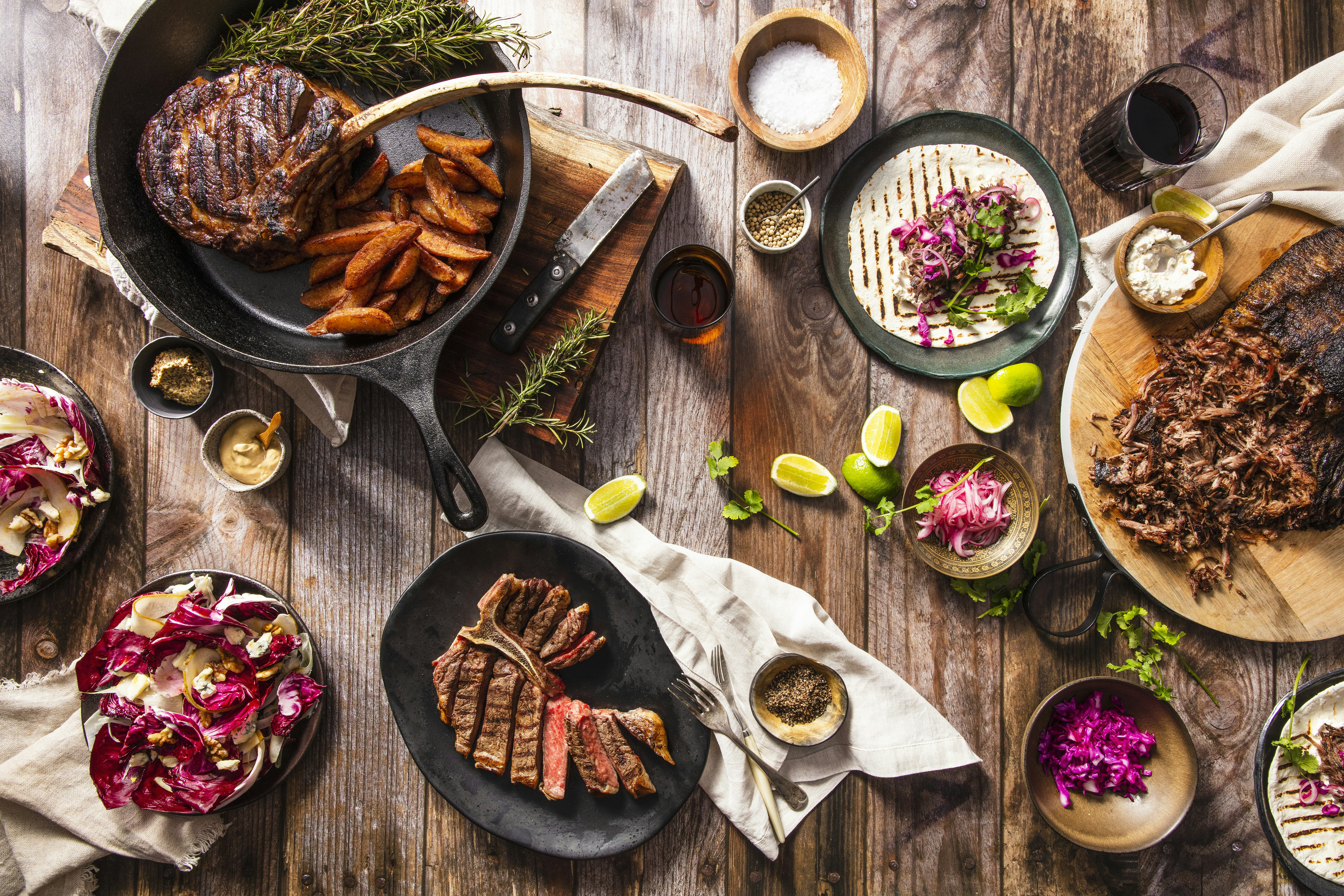 8. Grilled Meat On Black Pan Dinner Teams Background
