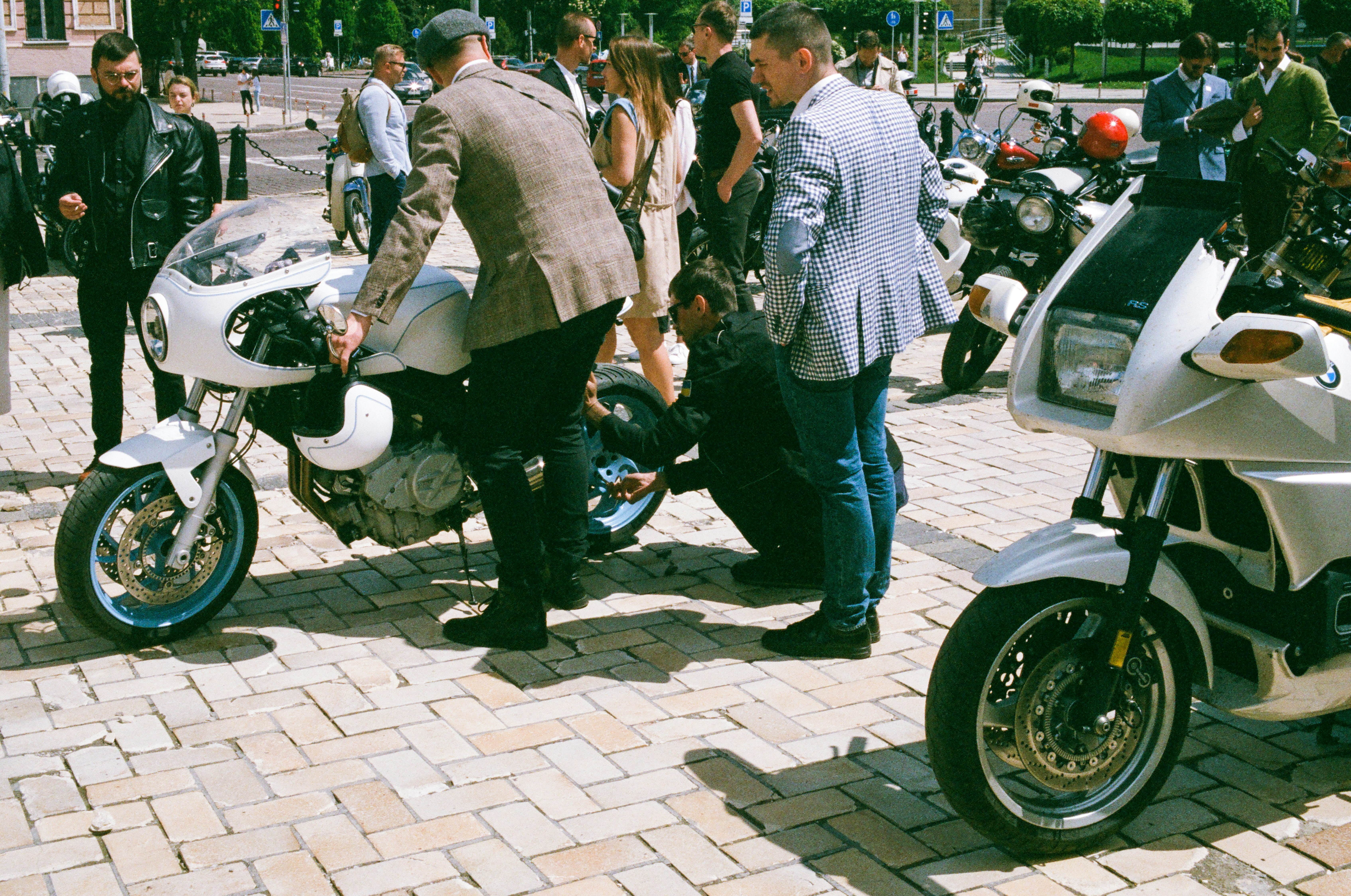 person wearing gray suit jacket riding bmw motorcycle distinguished teams background