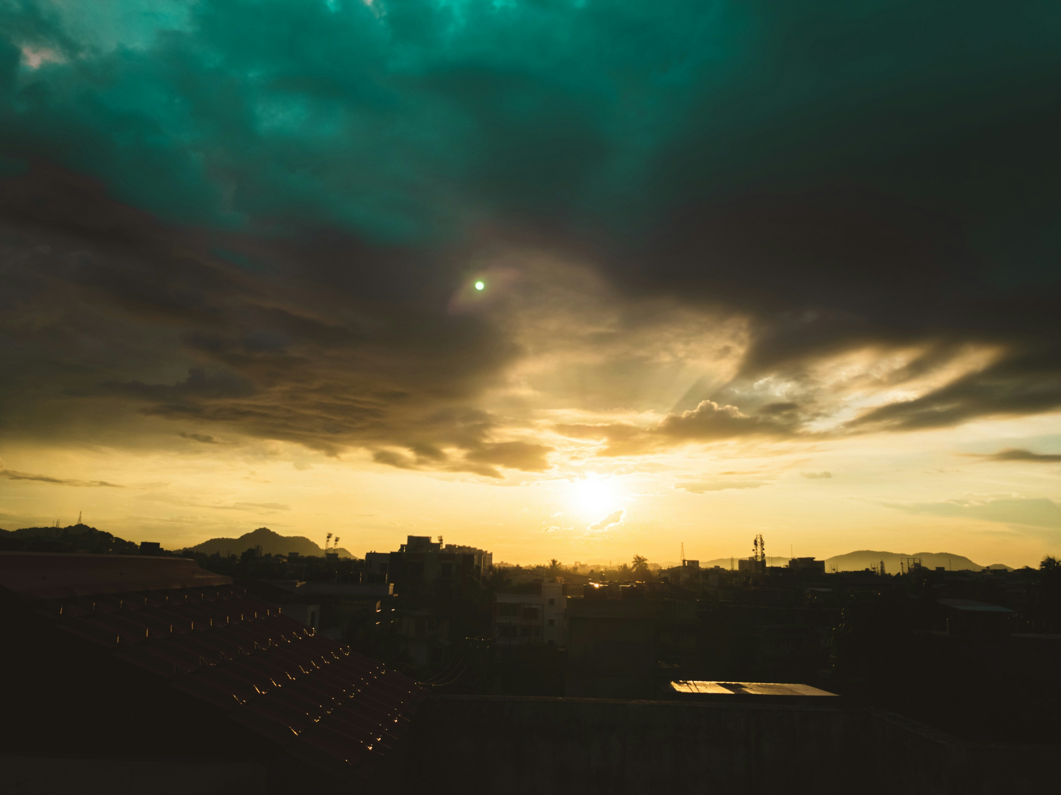 6. Silhouette Of City Buildings During Sunset Emerald Green Teams Background