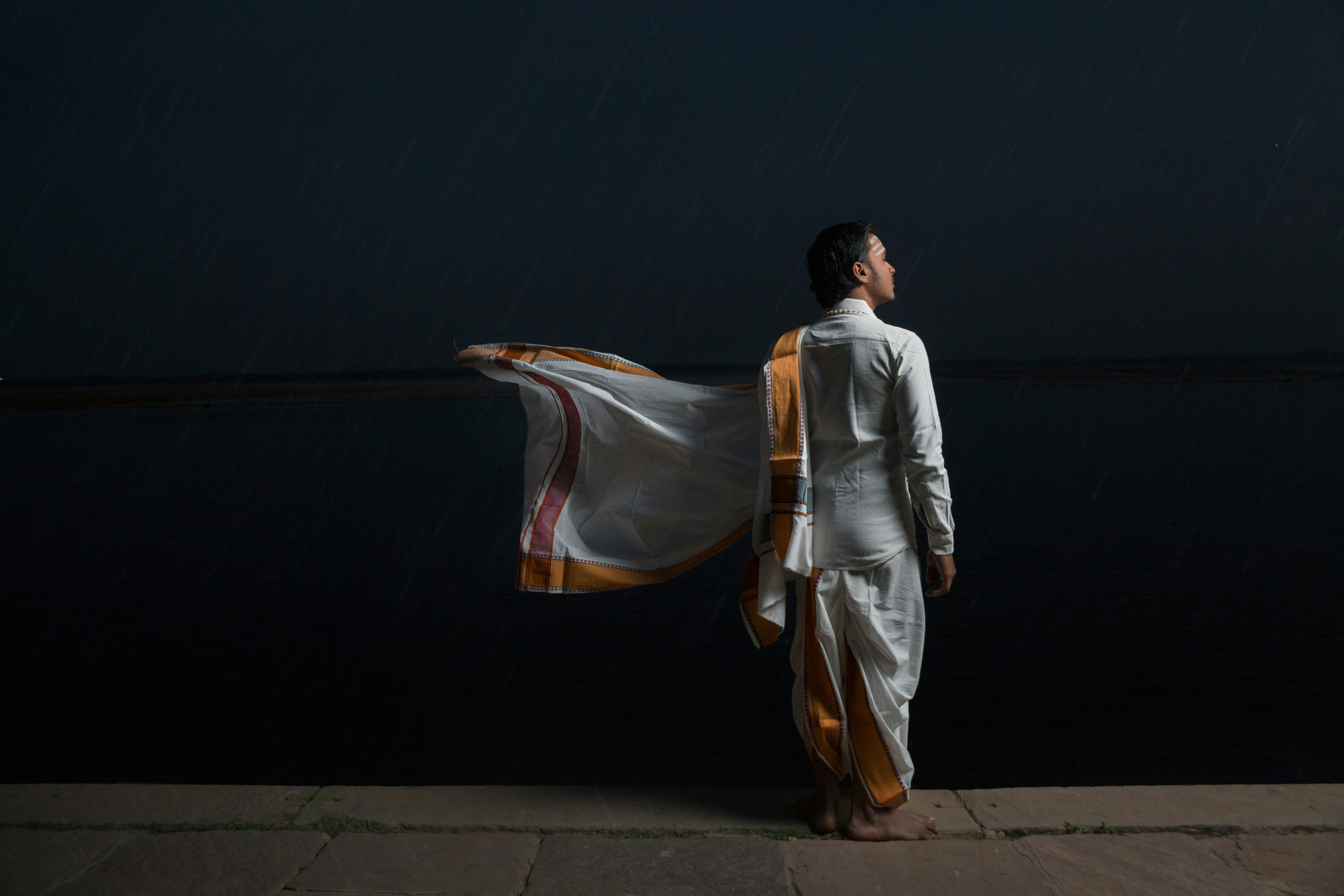 10. Man In White And Brown Traditional Dress Standing Beside Black Wall Evening Teams Background