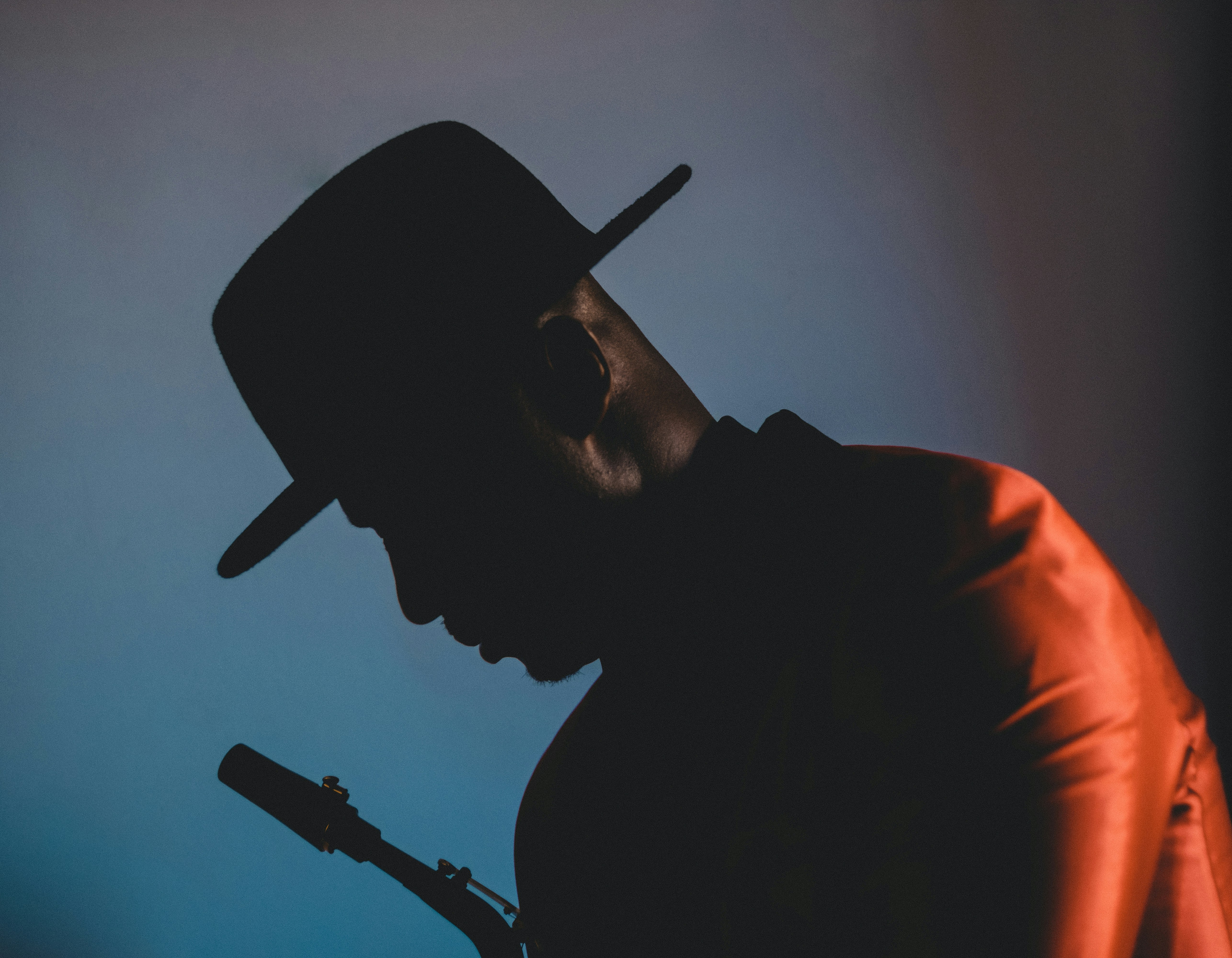 man in black crew neck shirt wearing black fitted cap evocative teams background