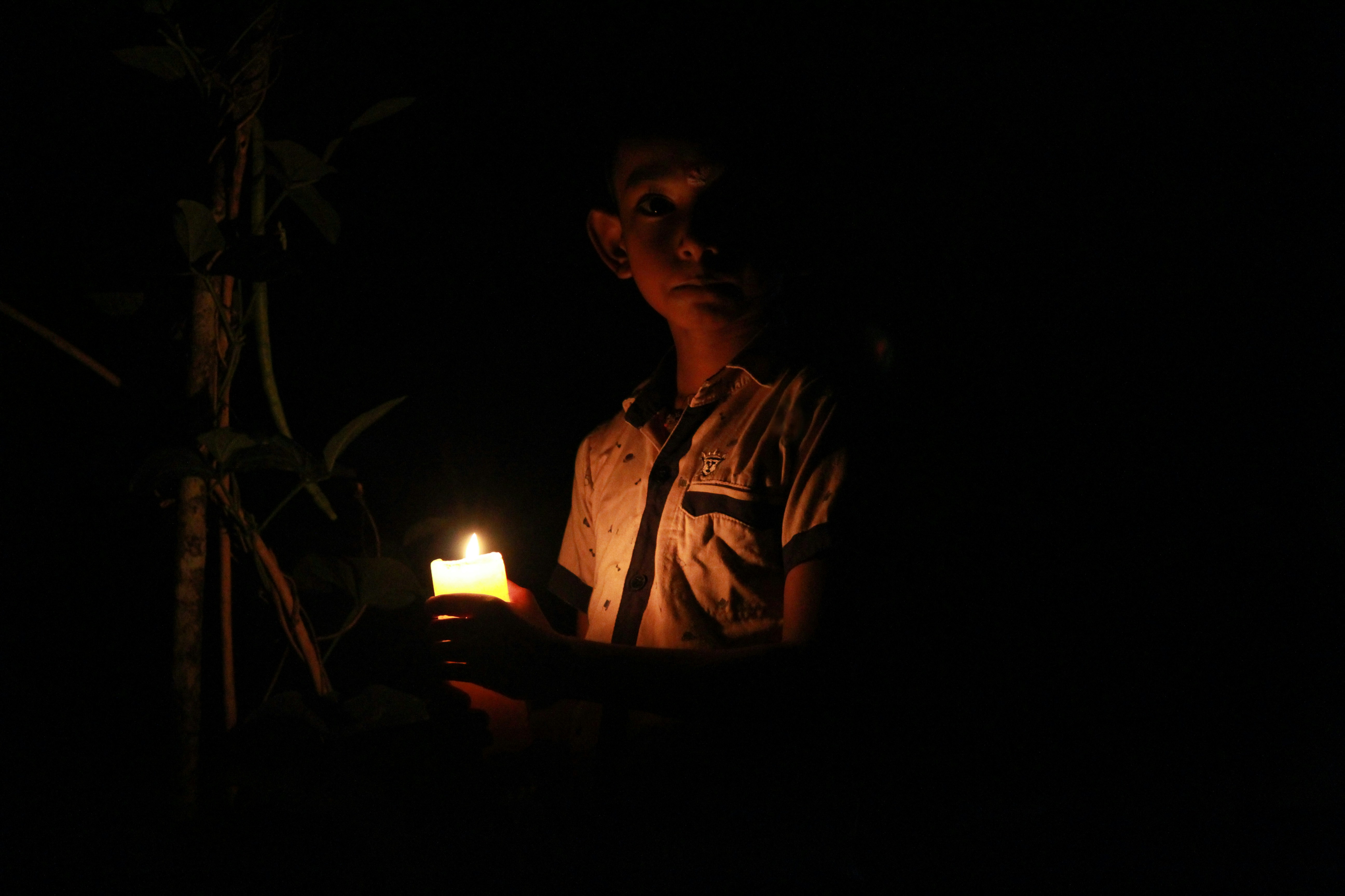 1. Man In White And Black Button Up Shirt Holding Lighted Candle Frightened Teams Background