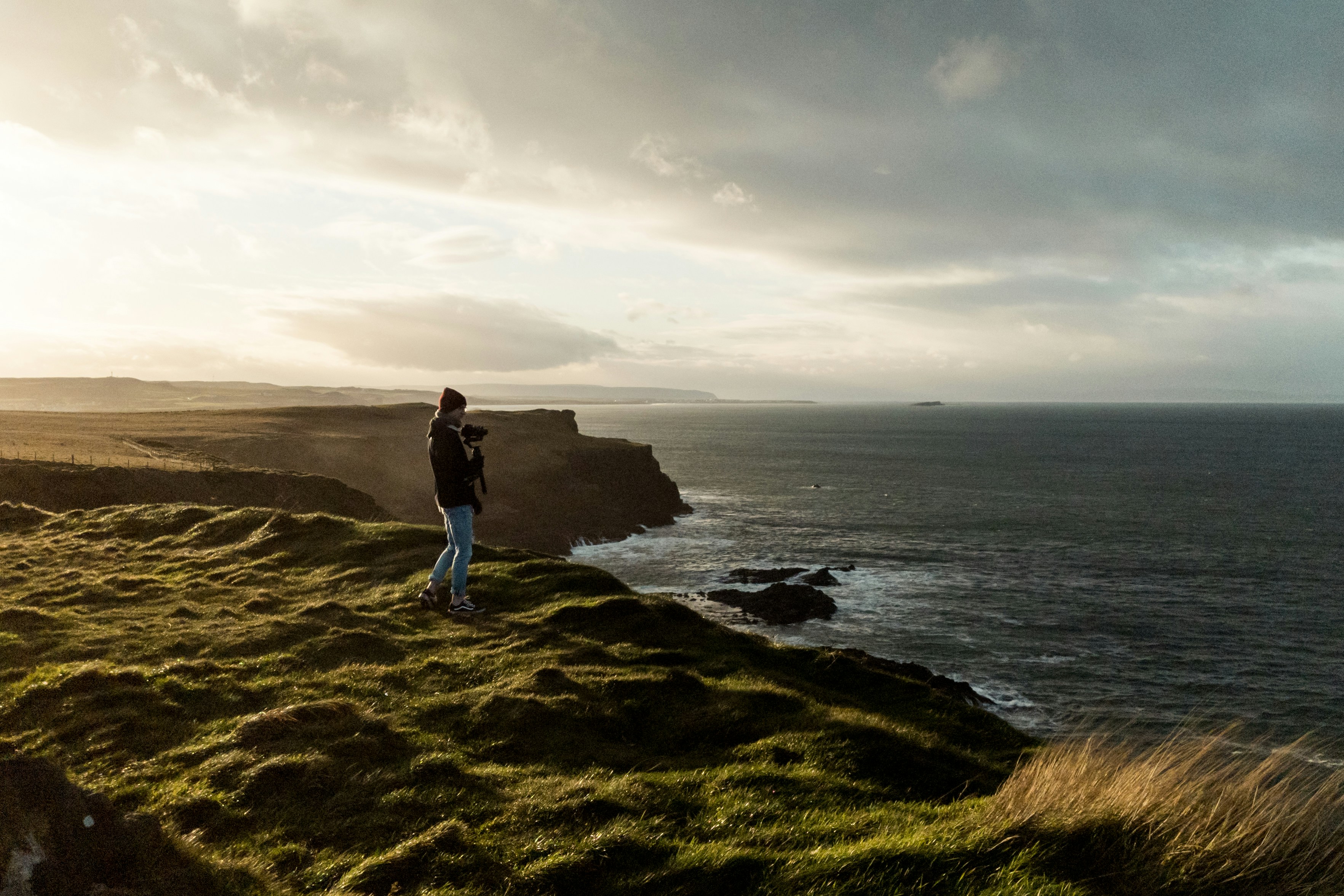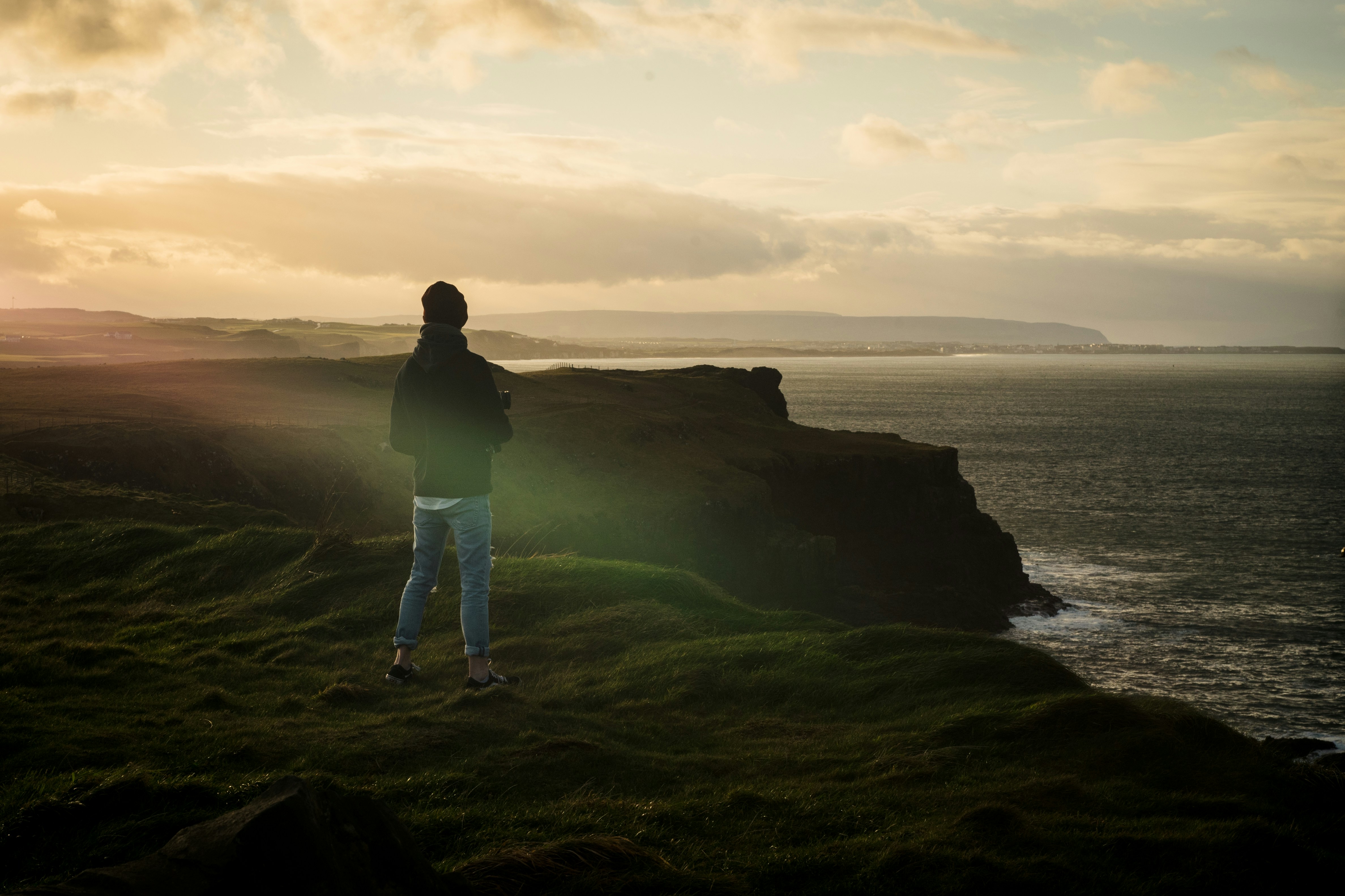 2. Man In Black Shirt And Blue Denim Jeans Standing On Cliff During Daytime Giants Teams Background