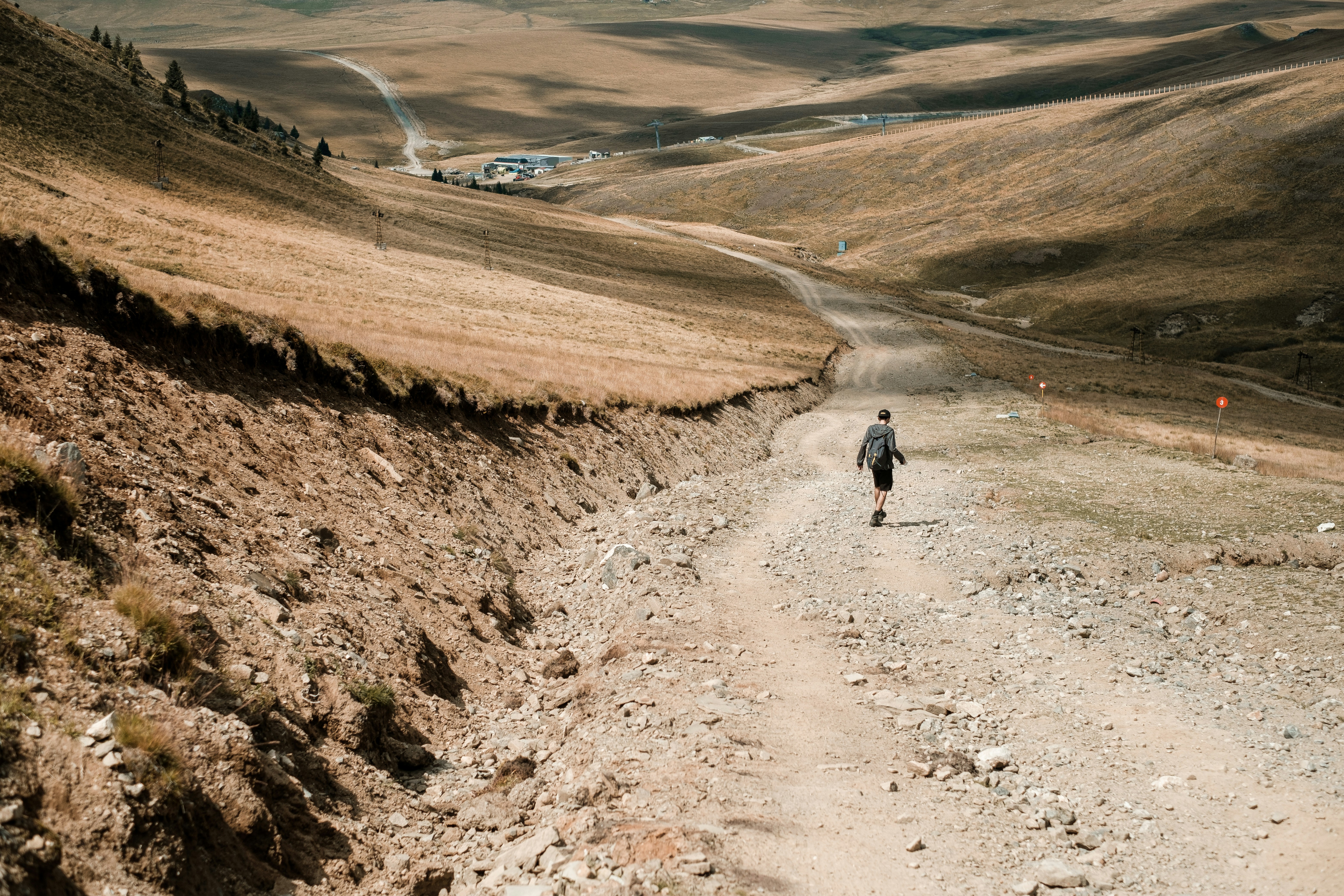 7. Person Wearing Gray Shirt Walking On Concrete Pathway Scenery Gravel Teams Background