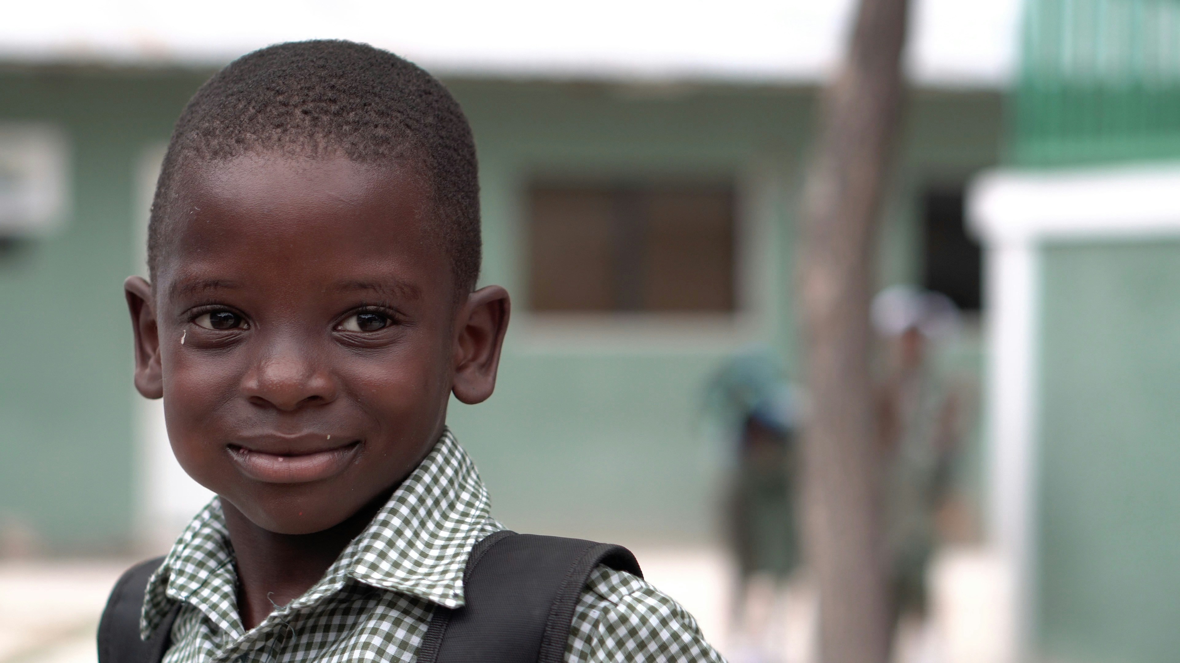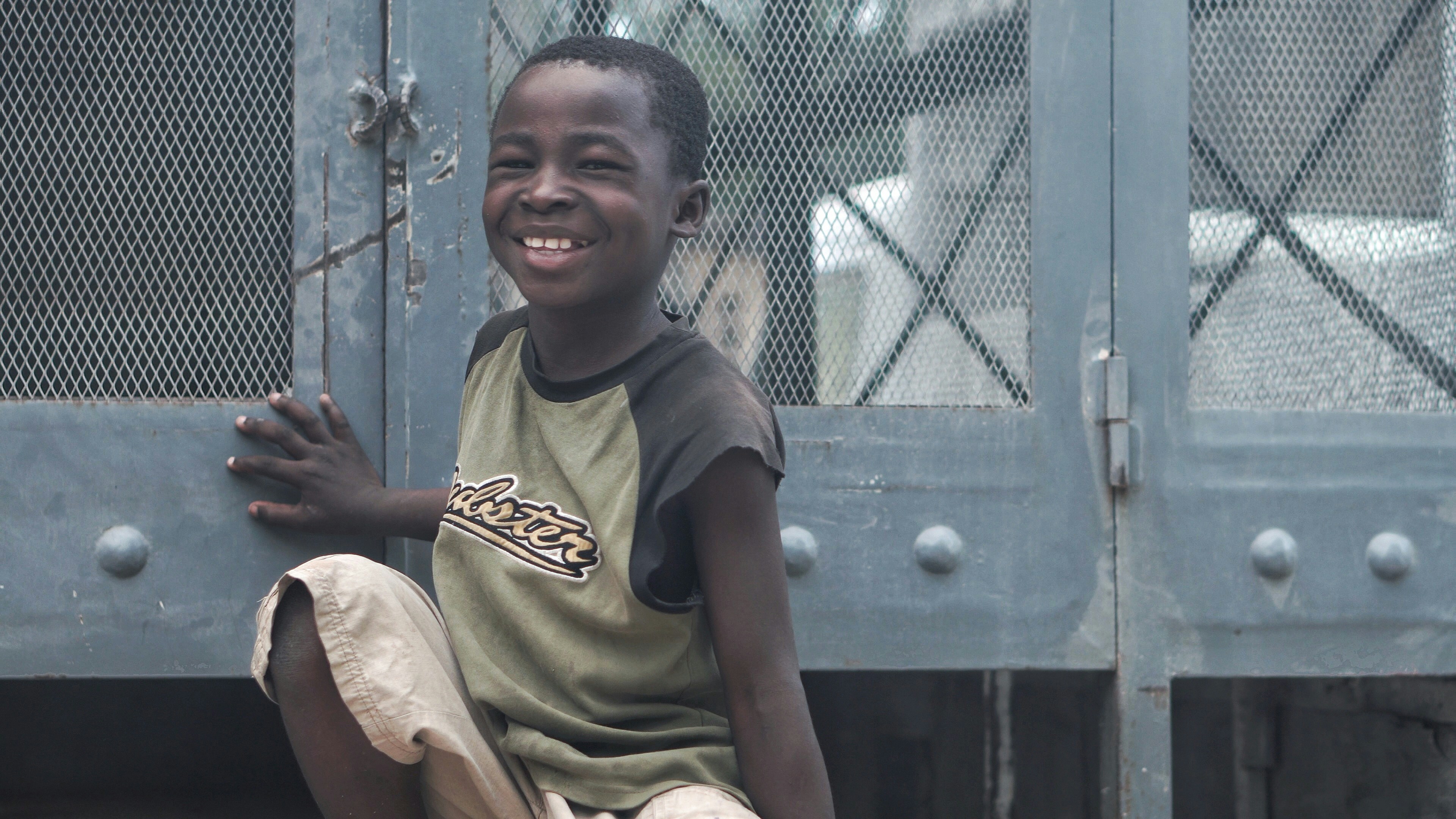 3. Smiling Boy Sitting Beside Gray Metal Board Haiti Teams Background