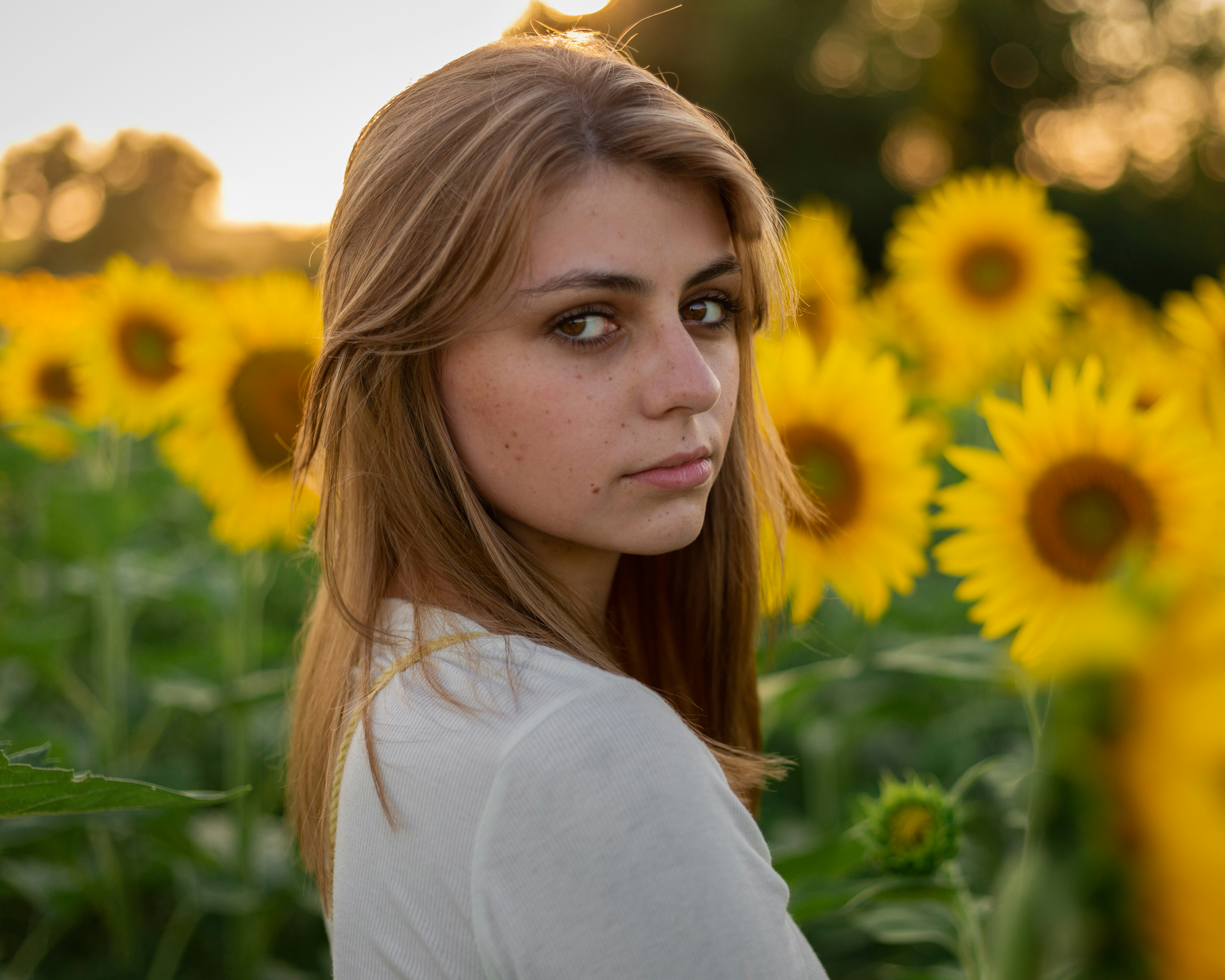 8. Woman In White Long Sleeve Shirt Standing On Sunflower Field During Daytime Iowa Teams Background