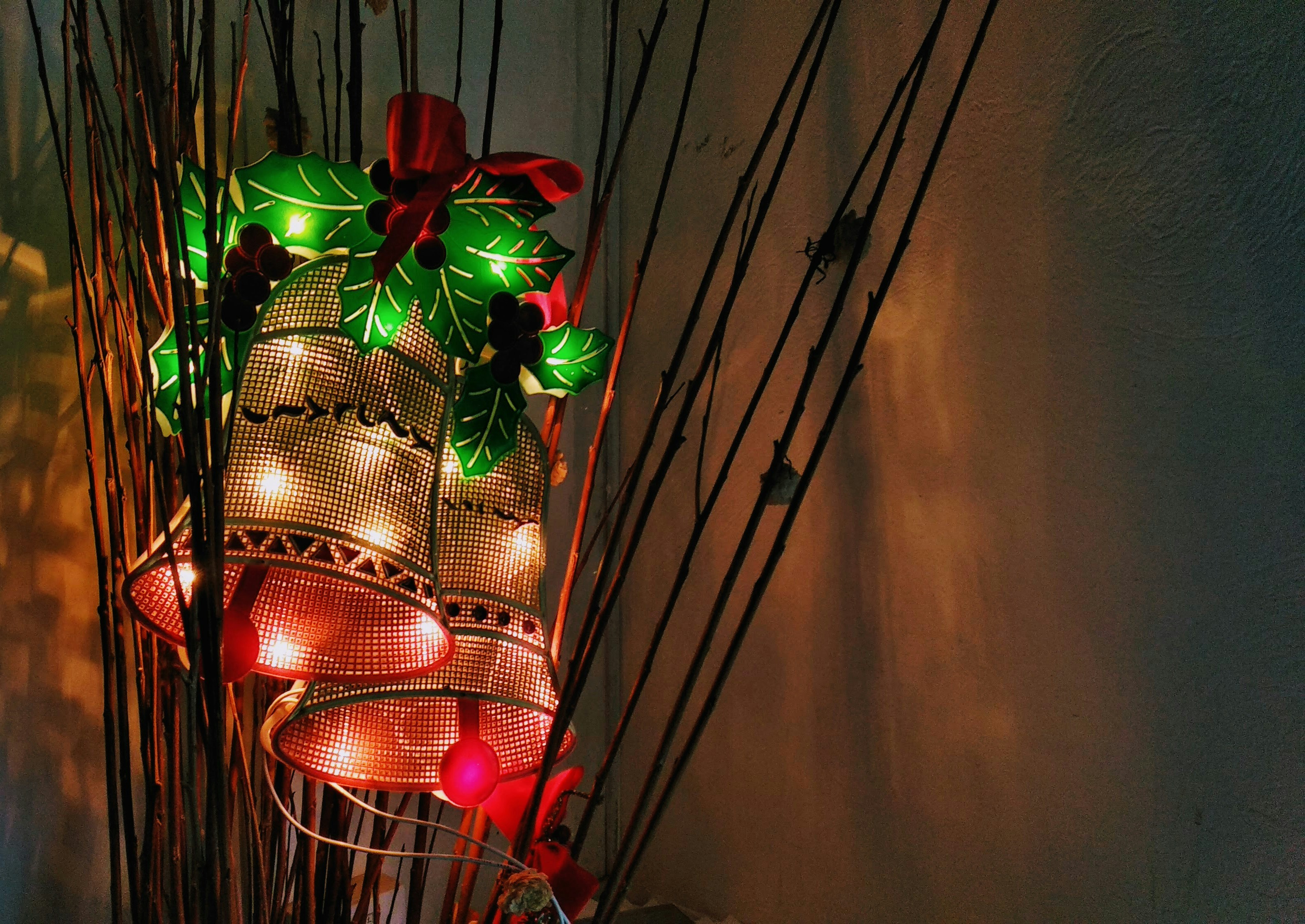 4. Two Red Steel Bells Beside Green Christmas Decoration Jingle Bells Teams Background