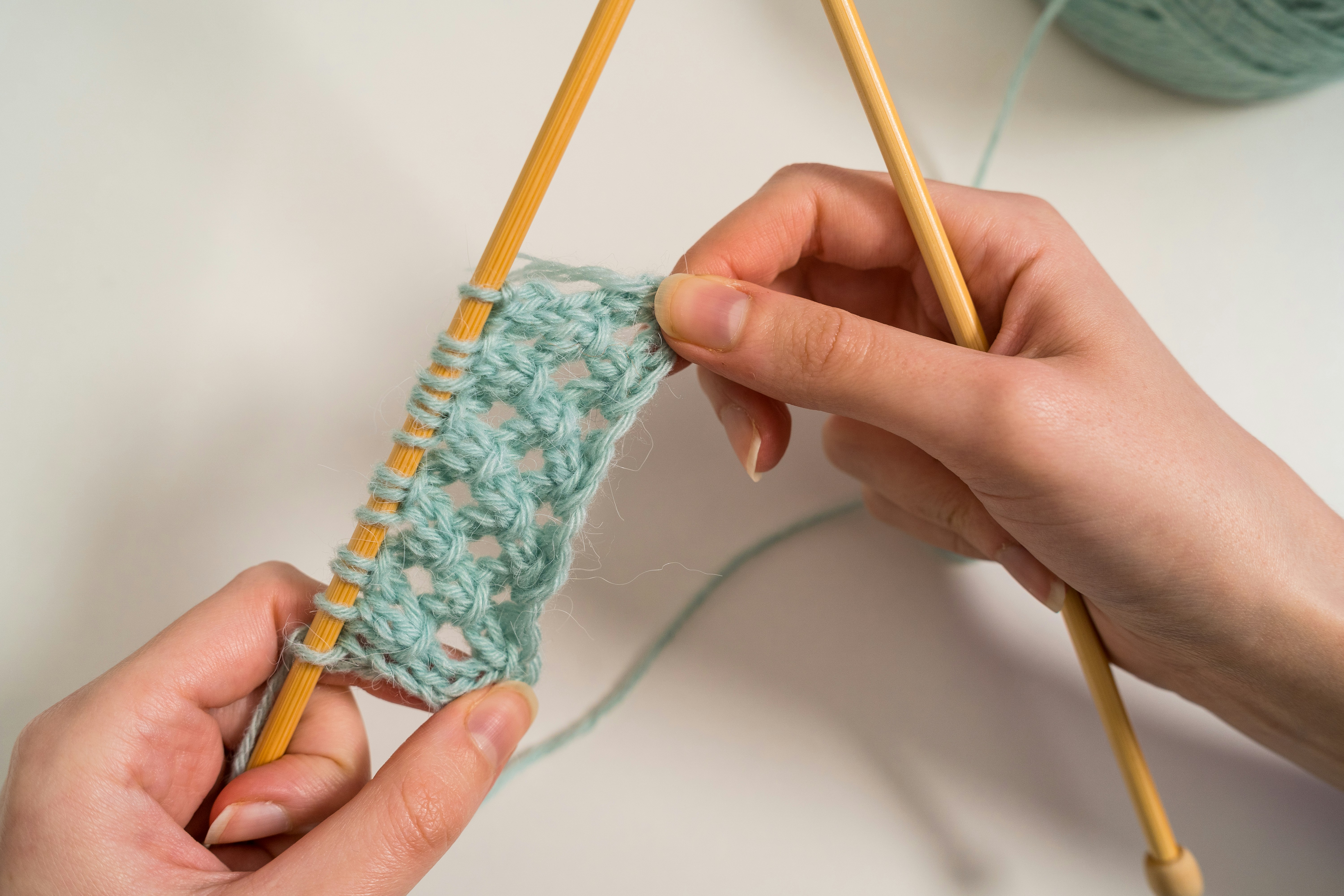 7. Person Holding Blue And White Yarn Knitting Teams Background