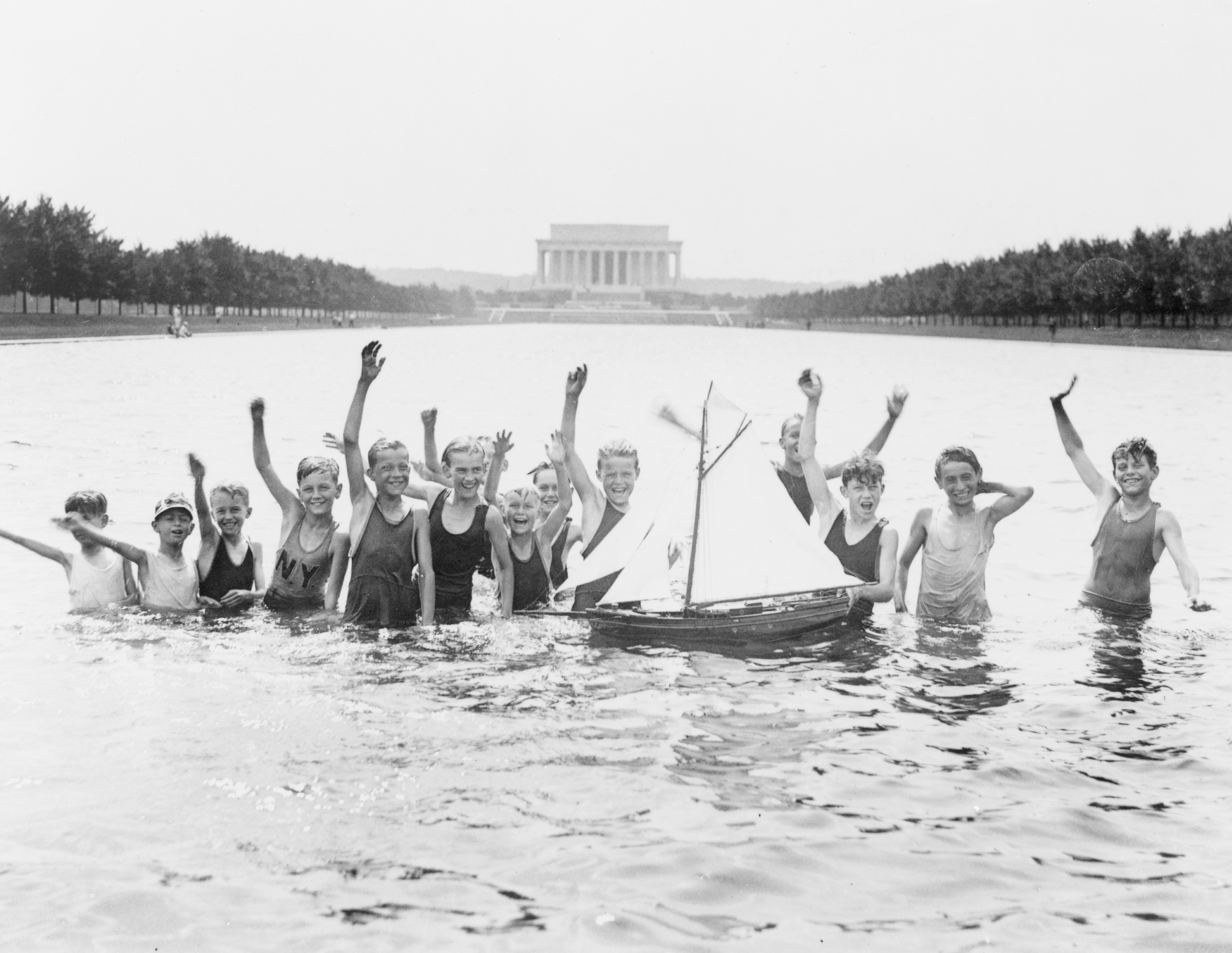 2. Group Of Boys Waving As They Play In The Reflecting Pool In Front Of The Lincoln Memorial Lincoln Memorial Teams Background