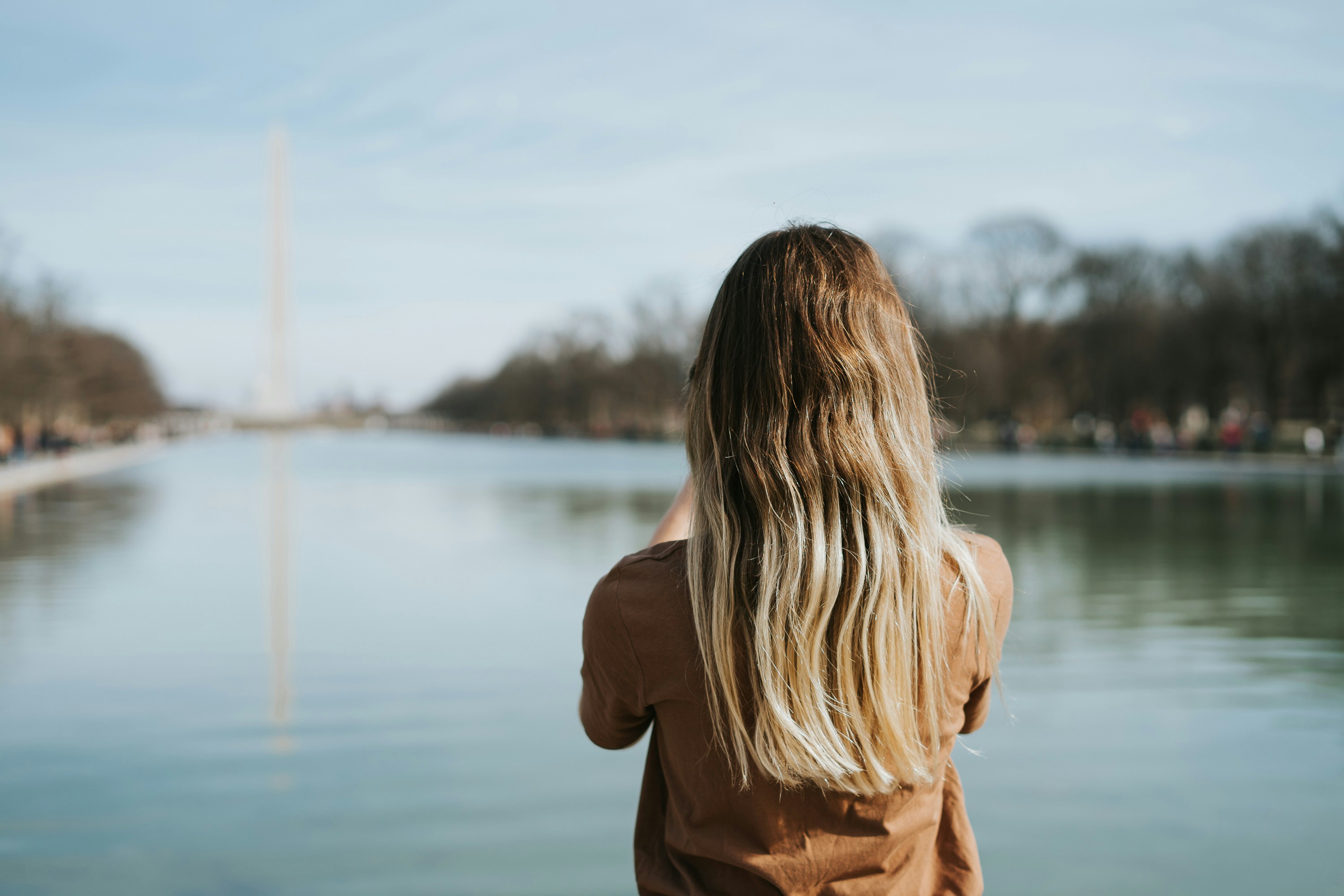 5. Woman In Brown Long Sleeve Shirt Standing Near Body Of Water During Daytime Lincoln Memorial Teams Background