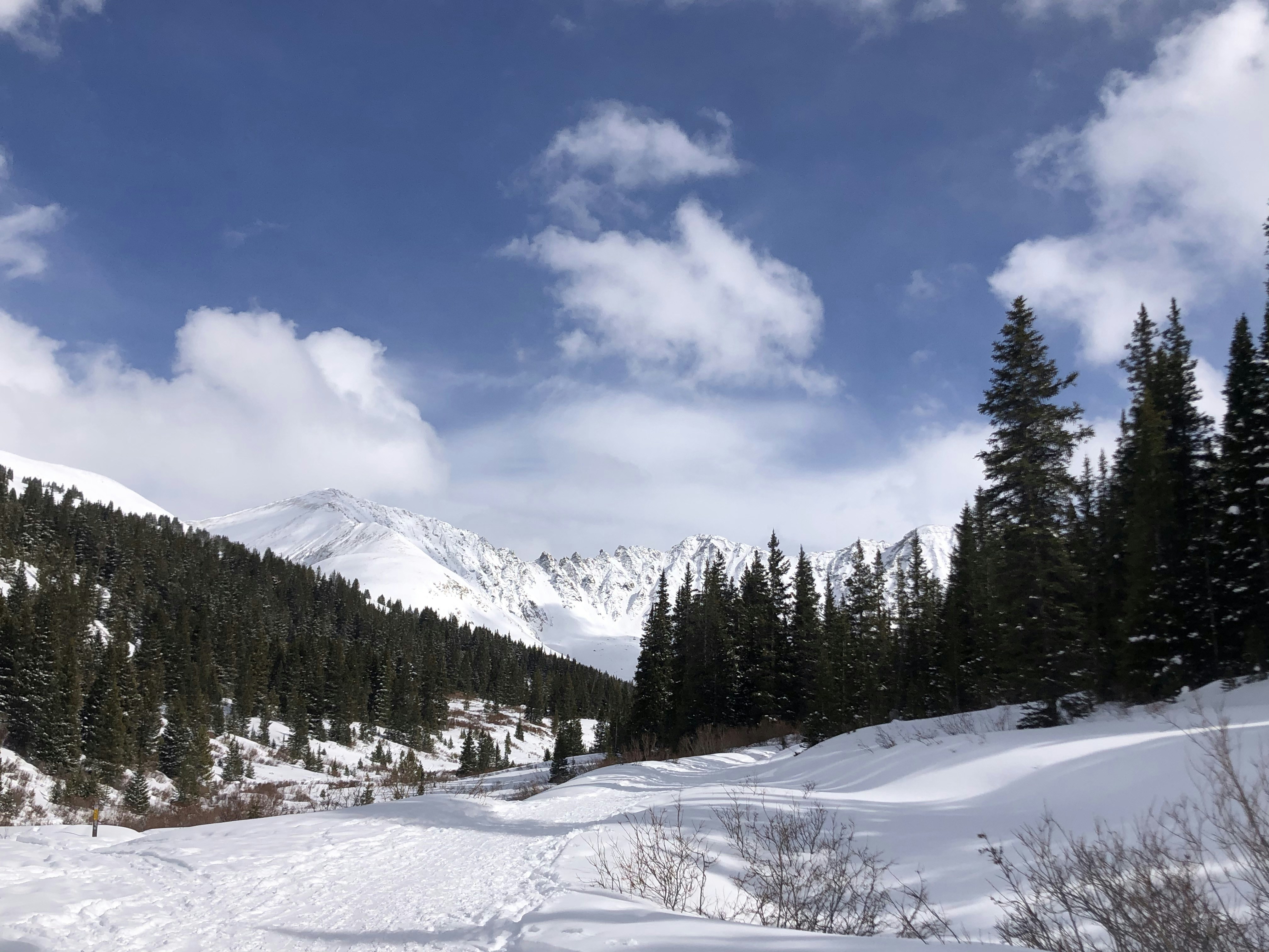 green pine trees on snow covered ground under blue sky and white clouds during daytime mayflower teams background