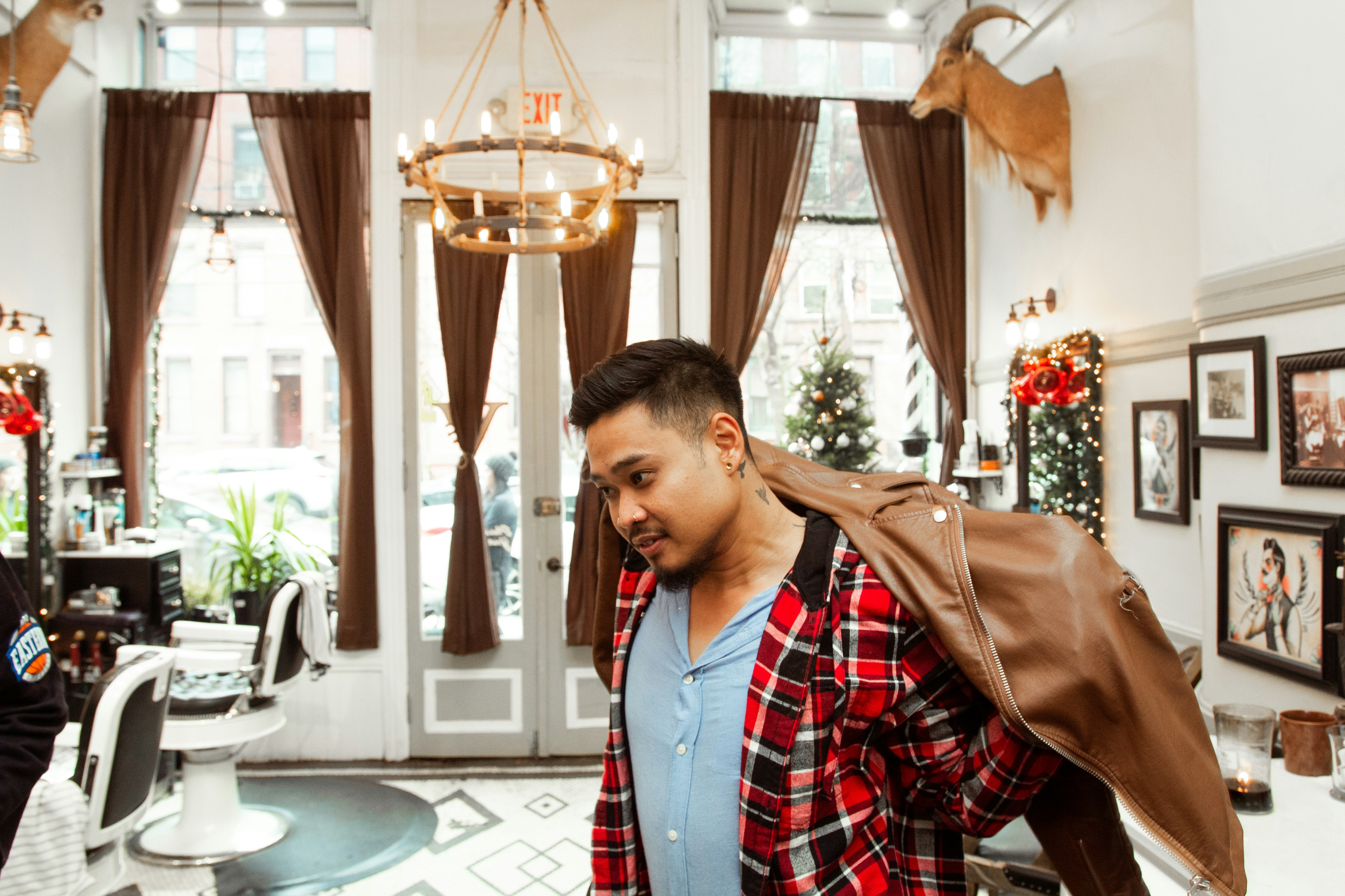 6. Man In Red Black And White Plaid Dress Shirt Holding Brown Leather Jacket New Jersey Teams Background
