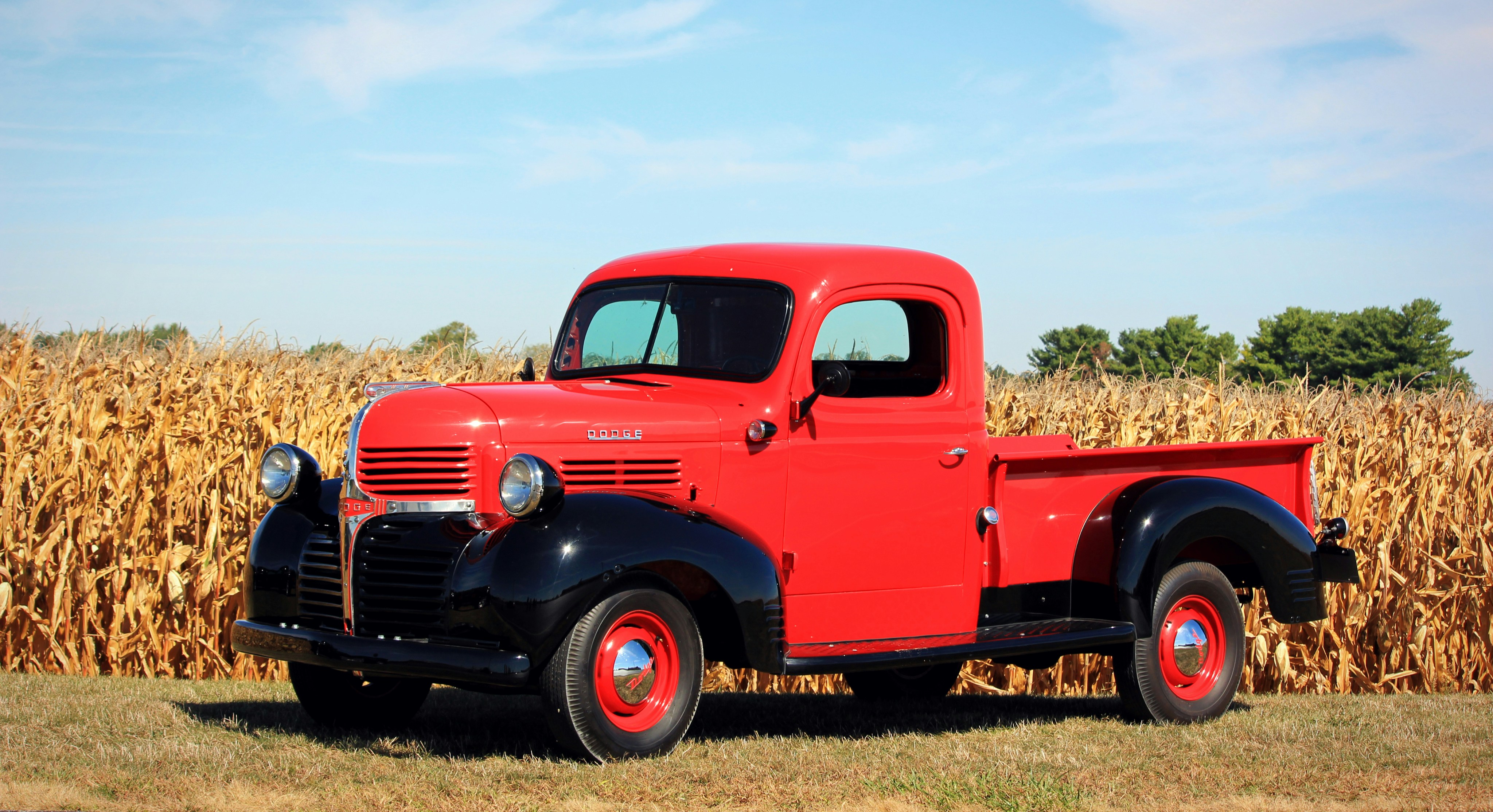 4. Red And Black Single Cab Pickup Truck Beside A Corn Field Ohio Teams Background