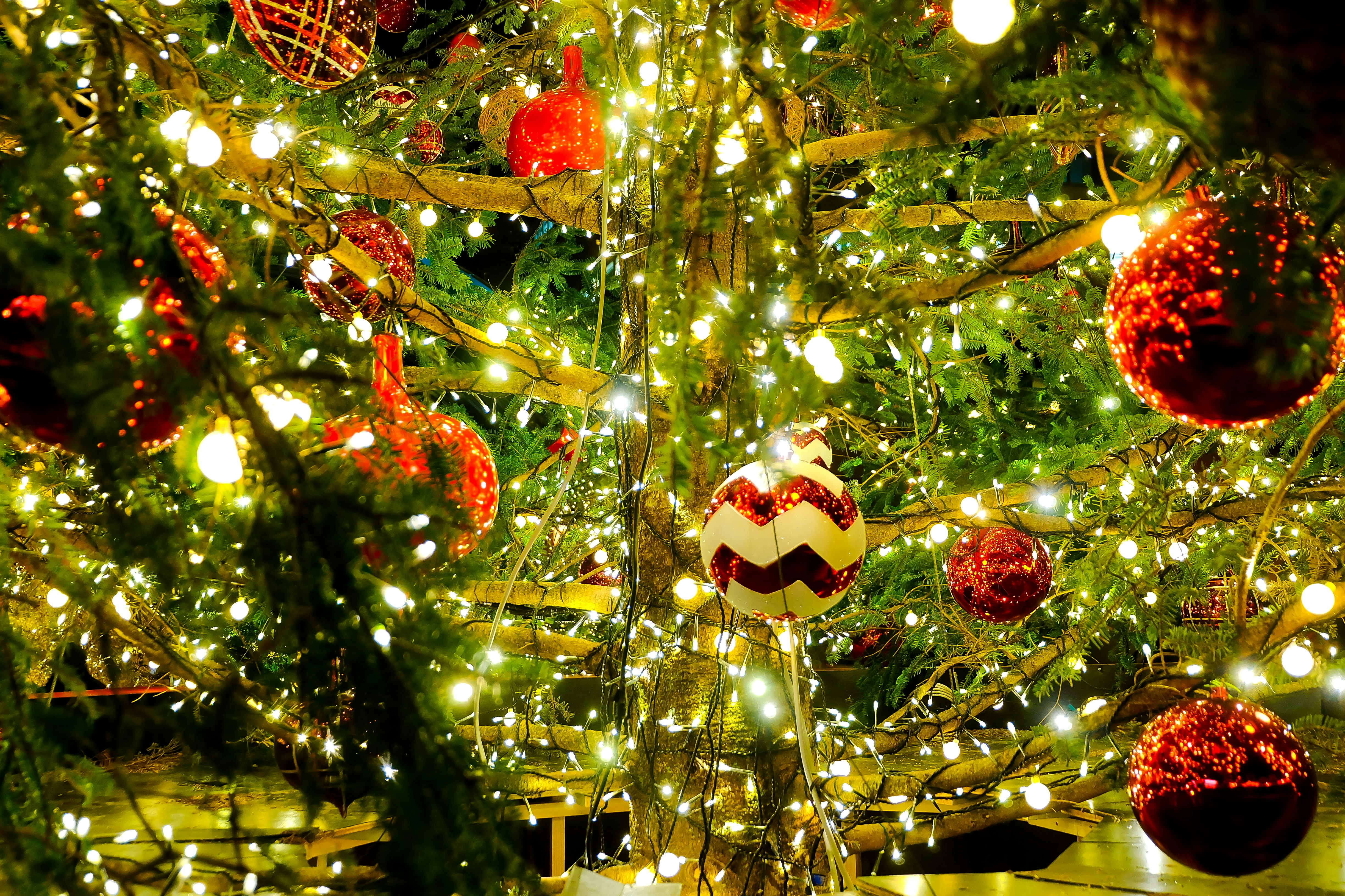 10. Red And White Baubles On Green Christmas Tree Ornament Teams Background