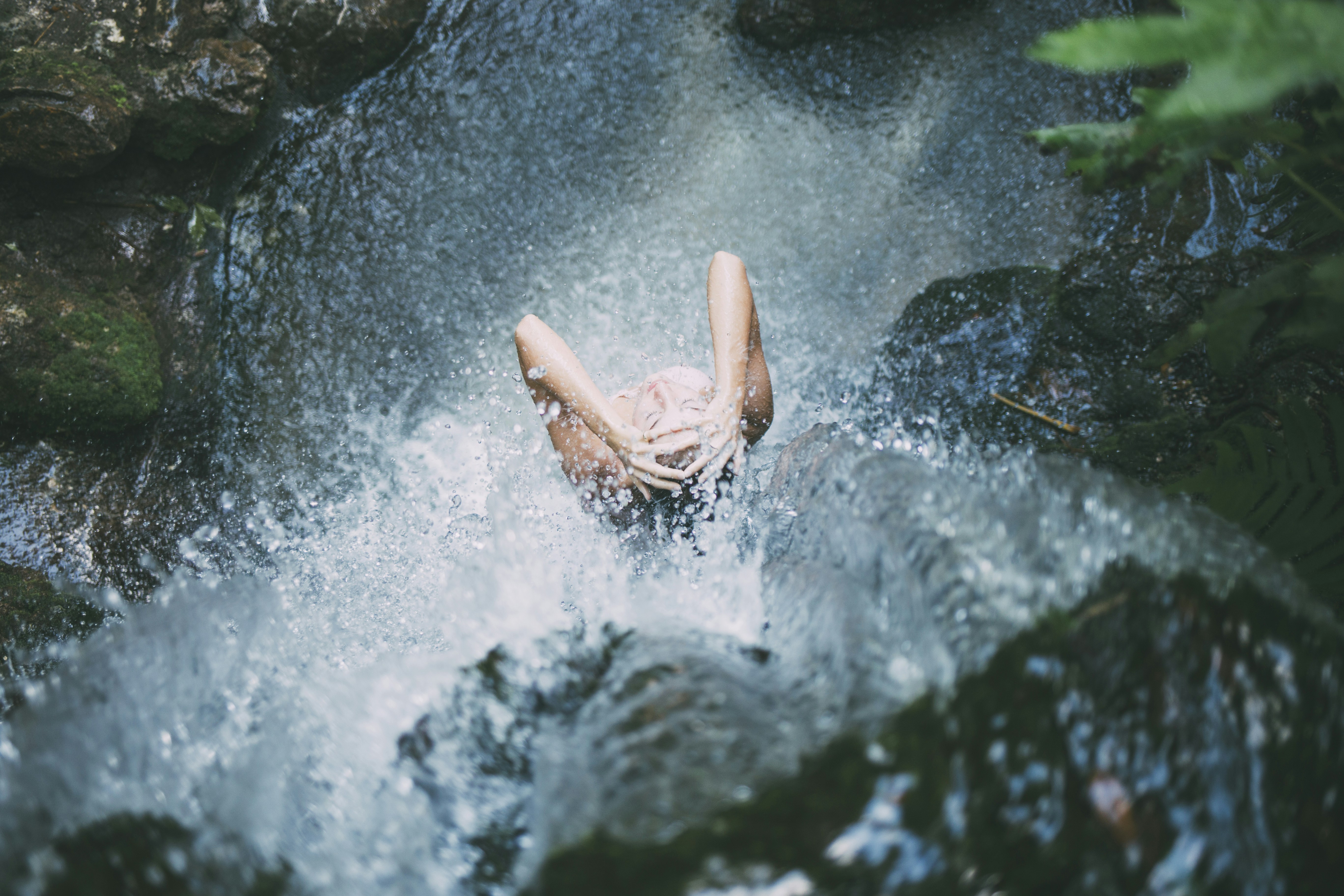 5. High-Angle Photography Of Woman Bathing Below Waterfalls During Daytime Refreshing Teams Background