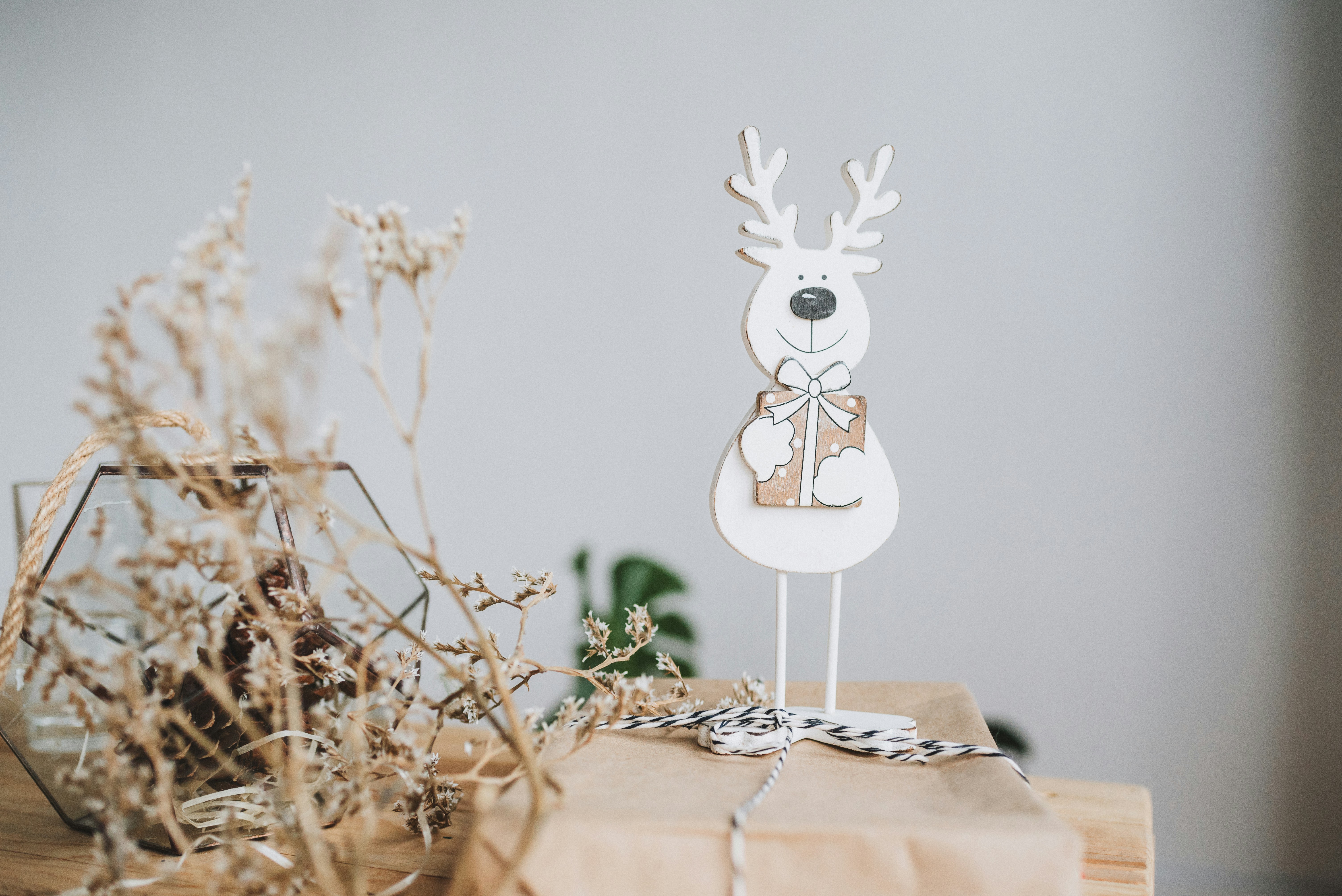 9. Six White Wooden Deer Decors On Brown Wooden Surface Reindeer Teams Background