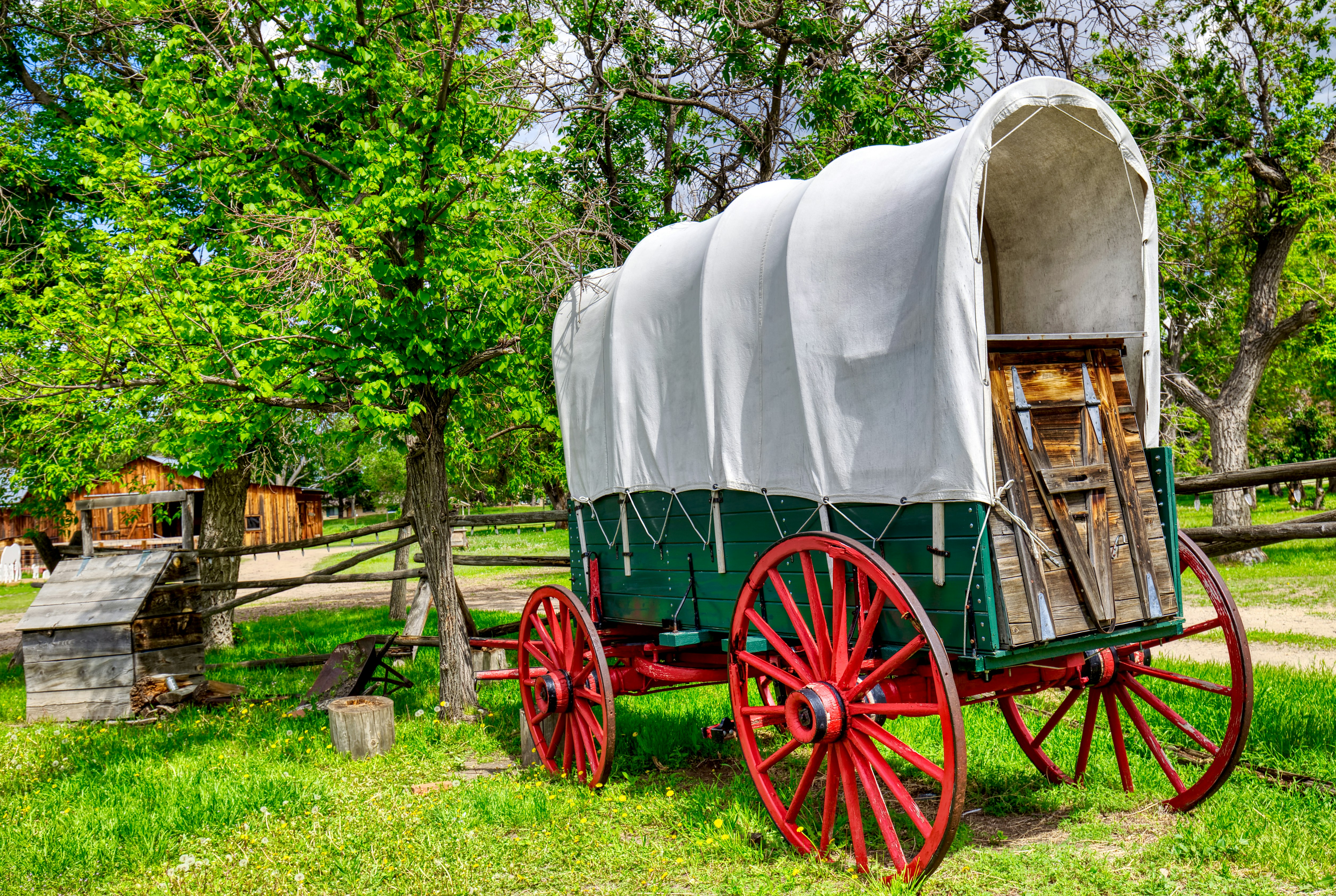 1. Green And Brown Wooden Carriage On Green Grass Field During Daytime Settlers Teams Background