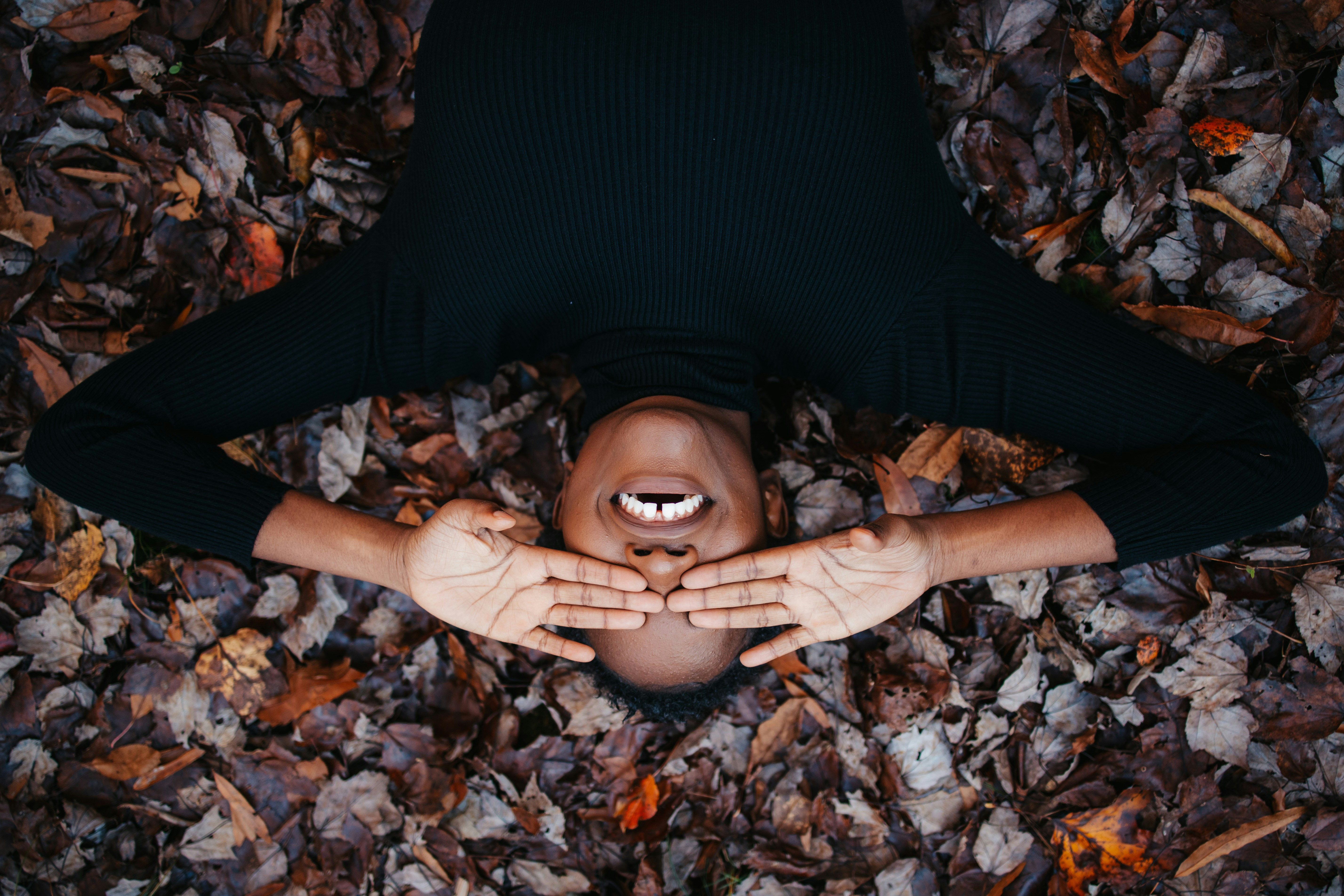 woman in black long sleeve shirt lying on dried leaves silly teams background