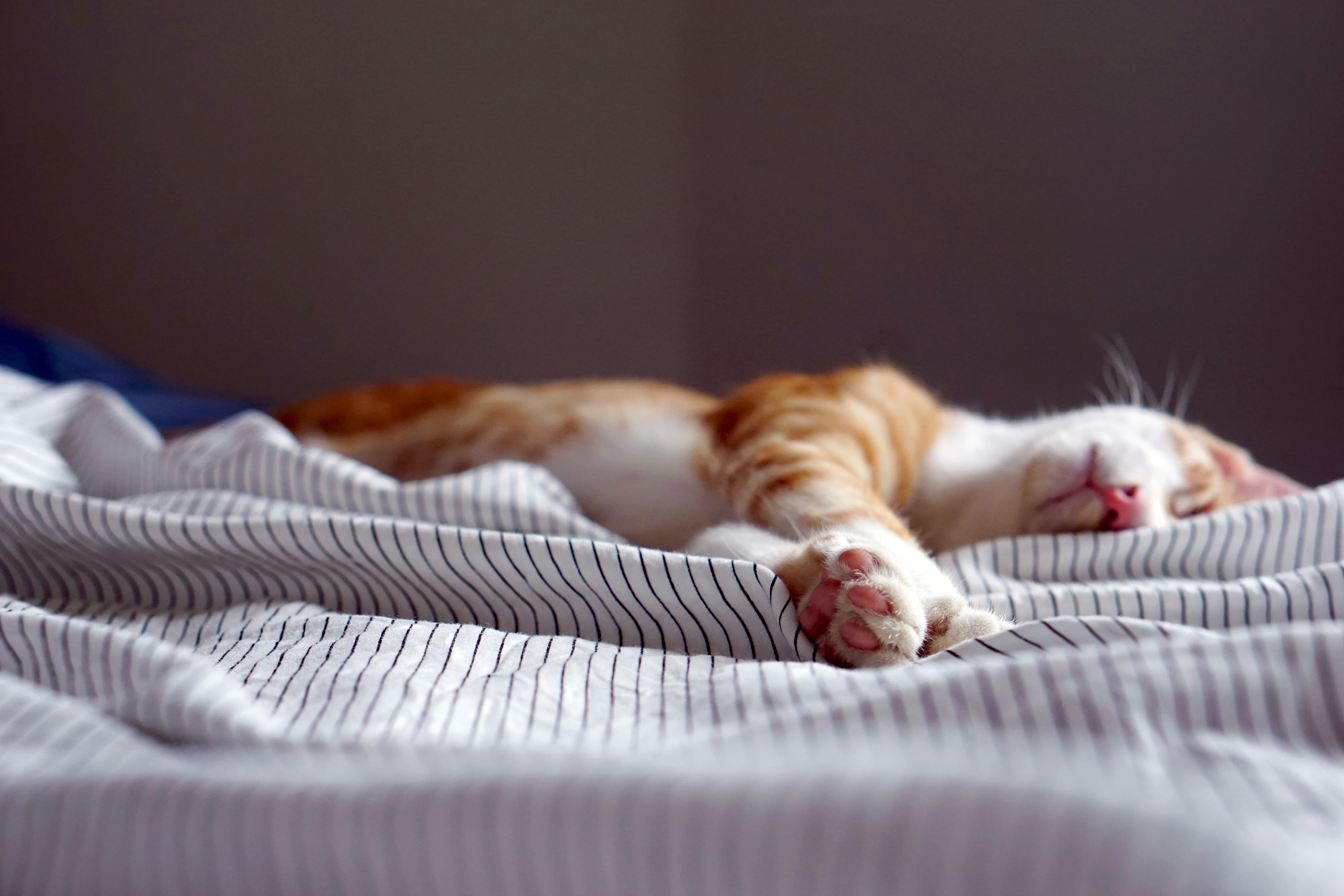 3. Orange Tabby Kitten Sleeping On Black And White Striped Textile Sleepy Teams Background