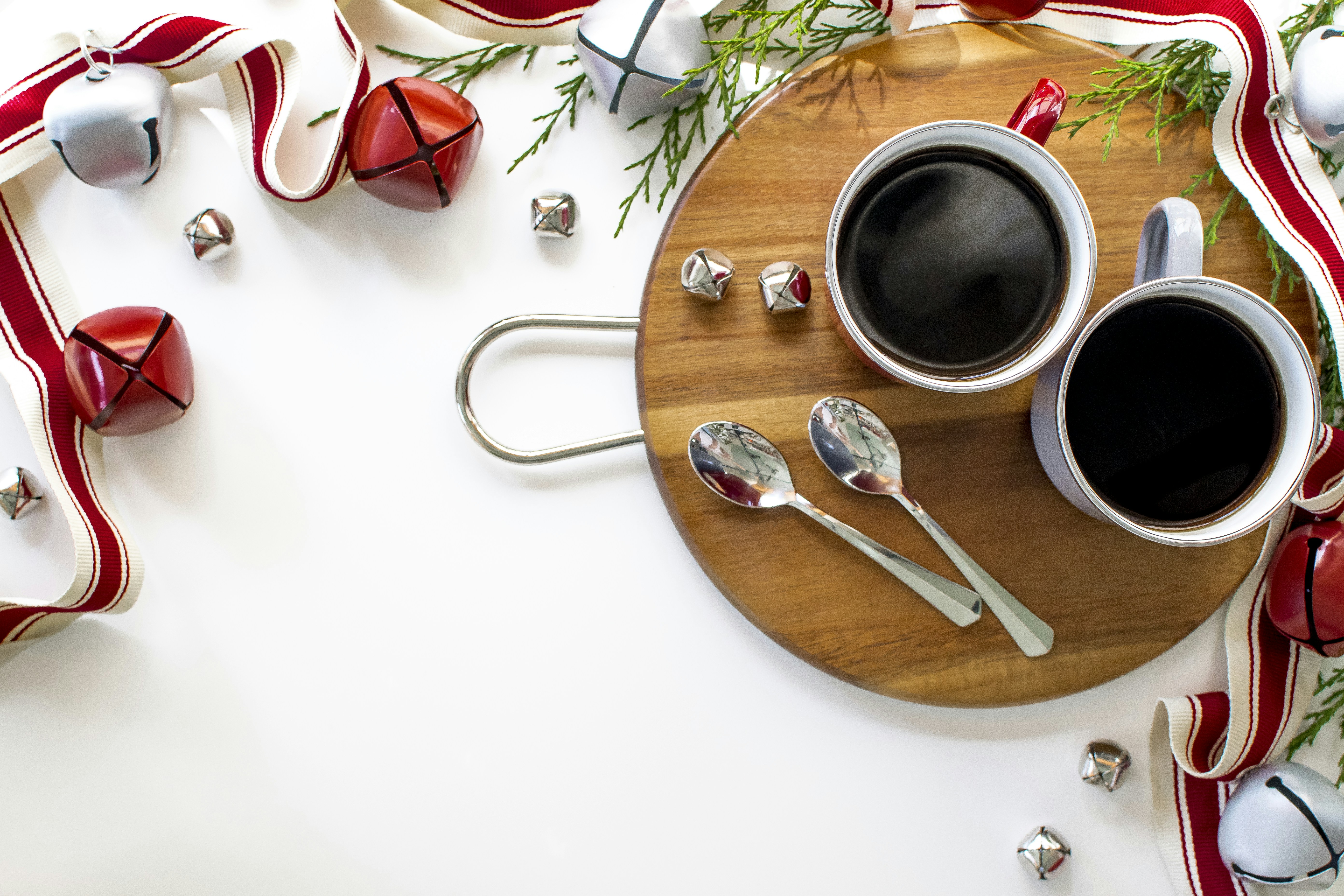 3. White Ceramic Mug On Brown Wooden Chopping Board Sleigh Bells Teams Background
