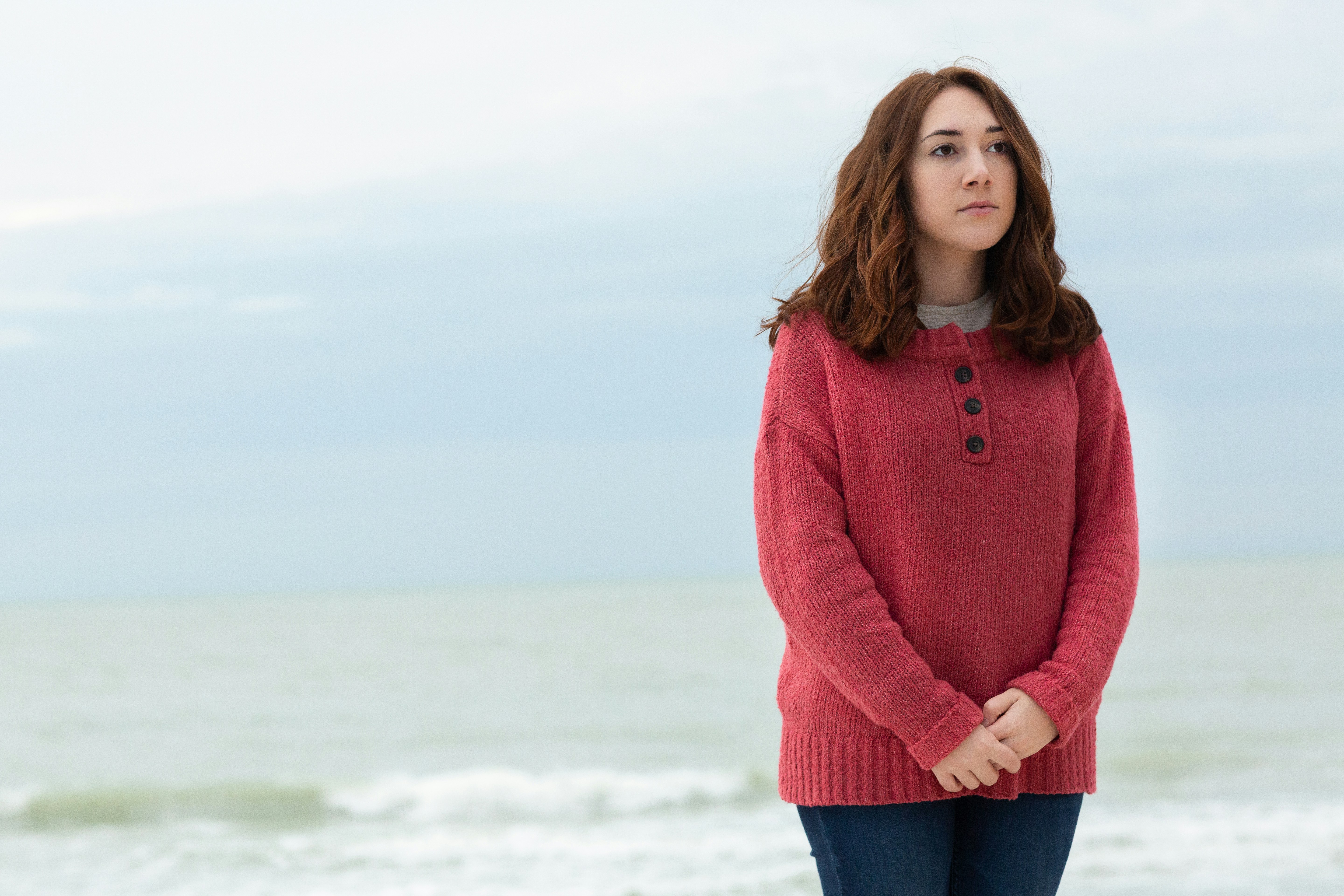 2. Standing Woman Wearing Red Sweater And Blue Denim Bottoms During Daytime Sweater Teams Background