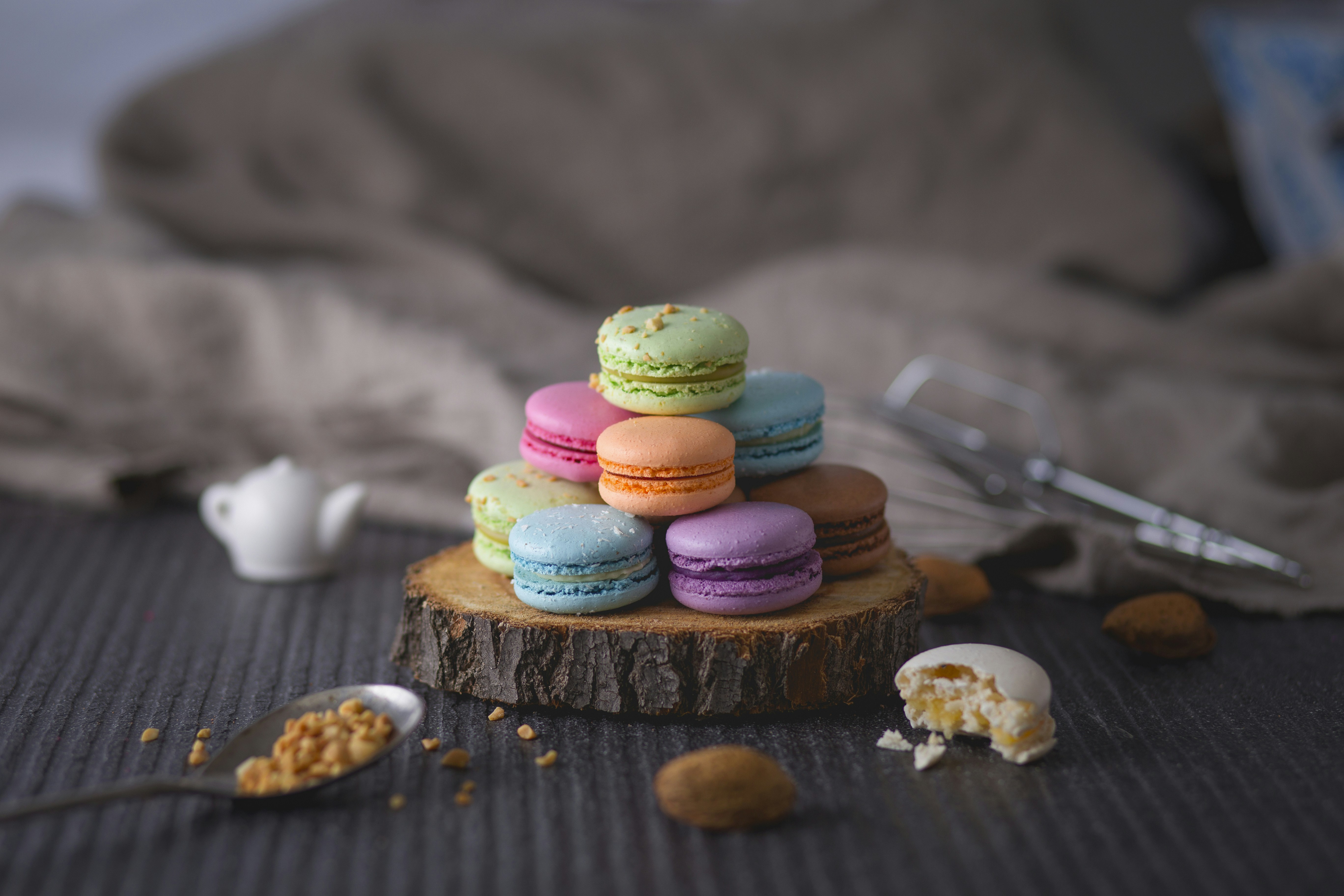 assorted-color macaroons on wood slab tasty teams background