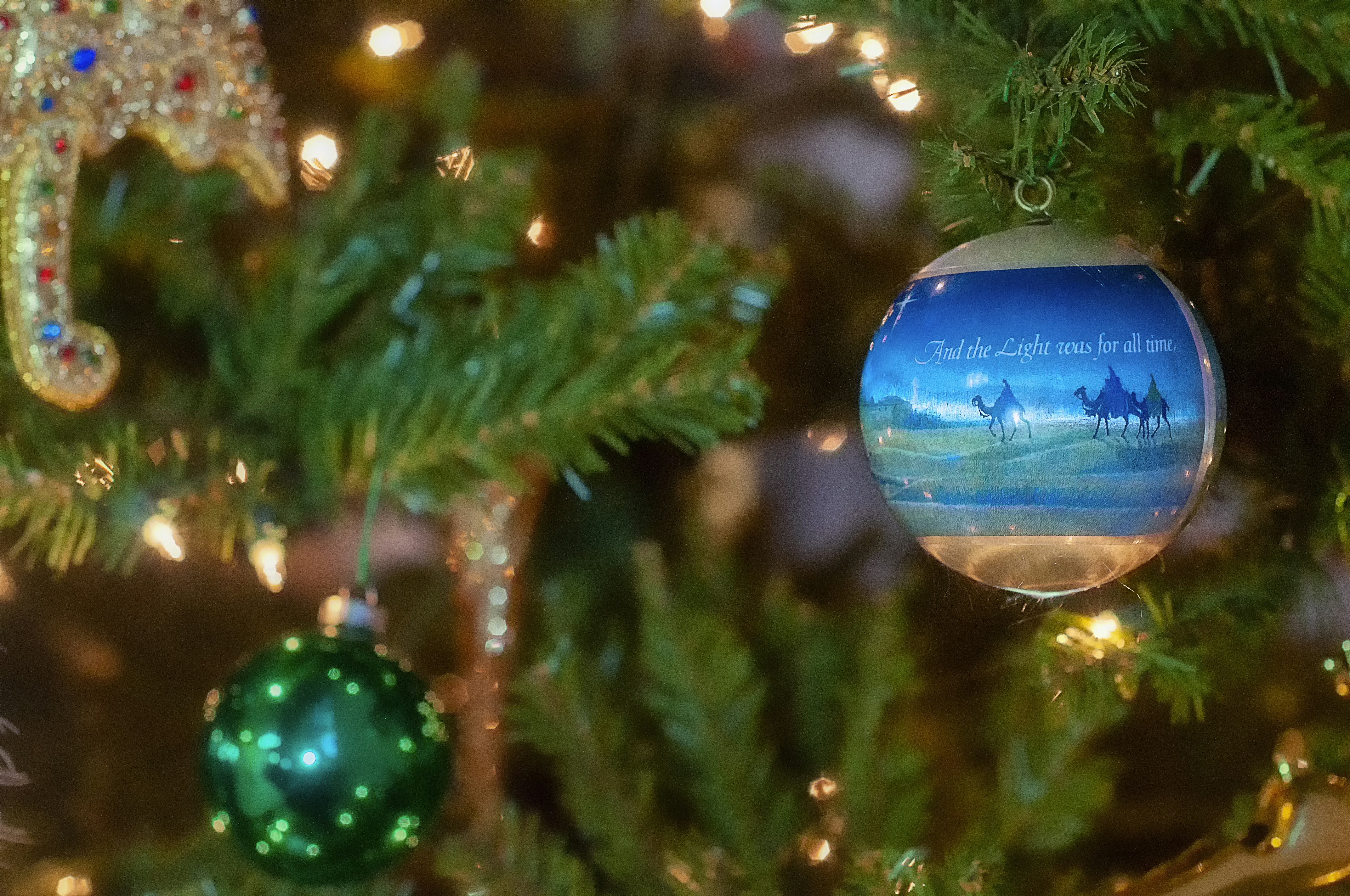 selective focus photography of ornaments hanged on green pine tree wise men teams background