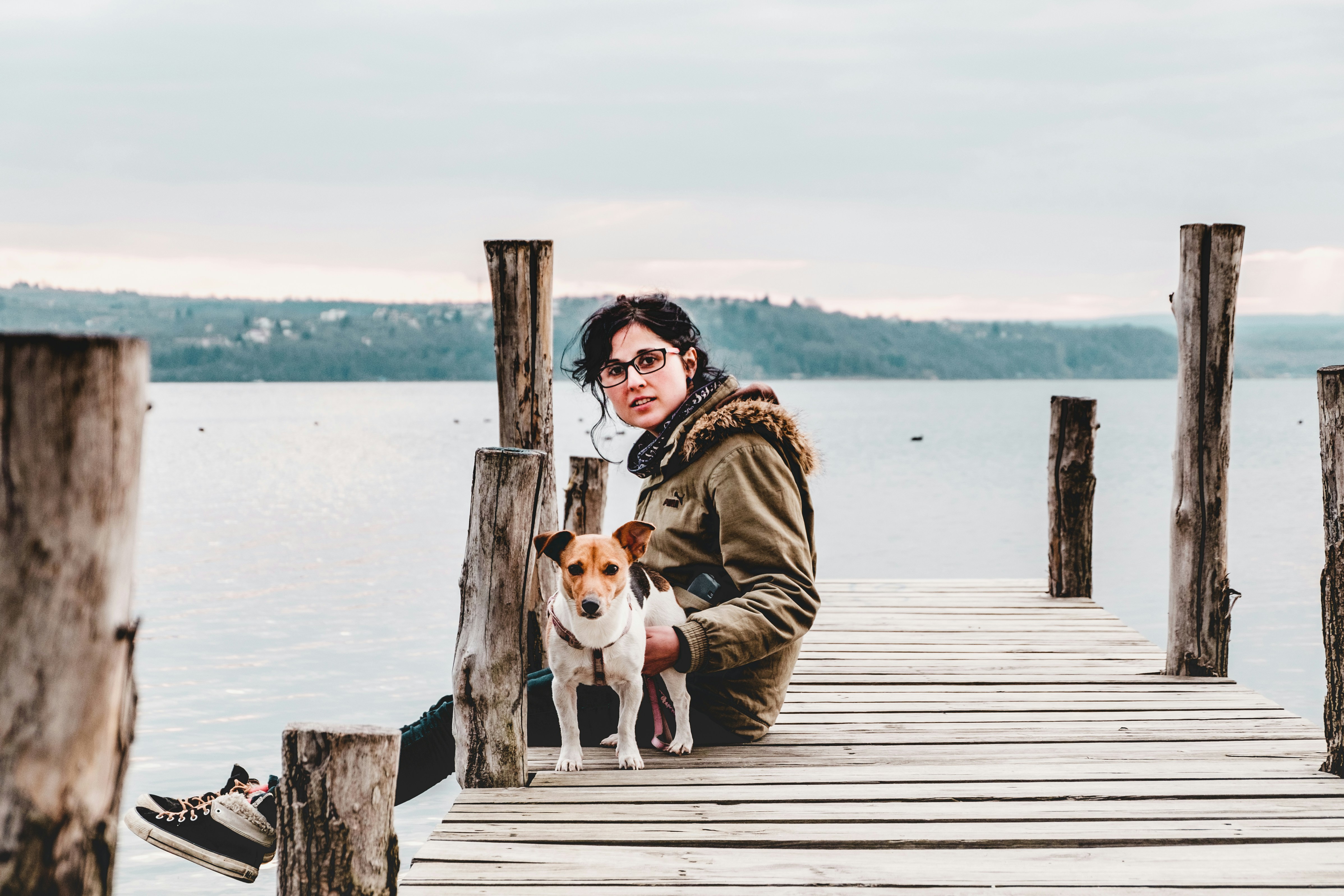 2. Woman Sitting On Brown Wooden Dock With Dog Best Zoom Background
