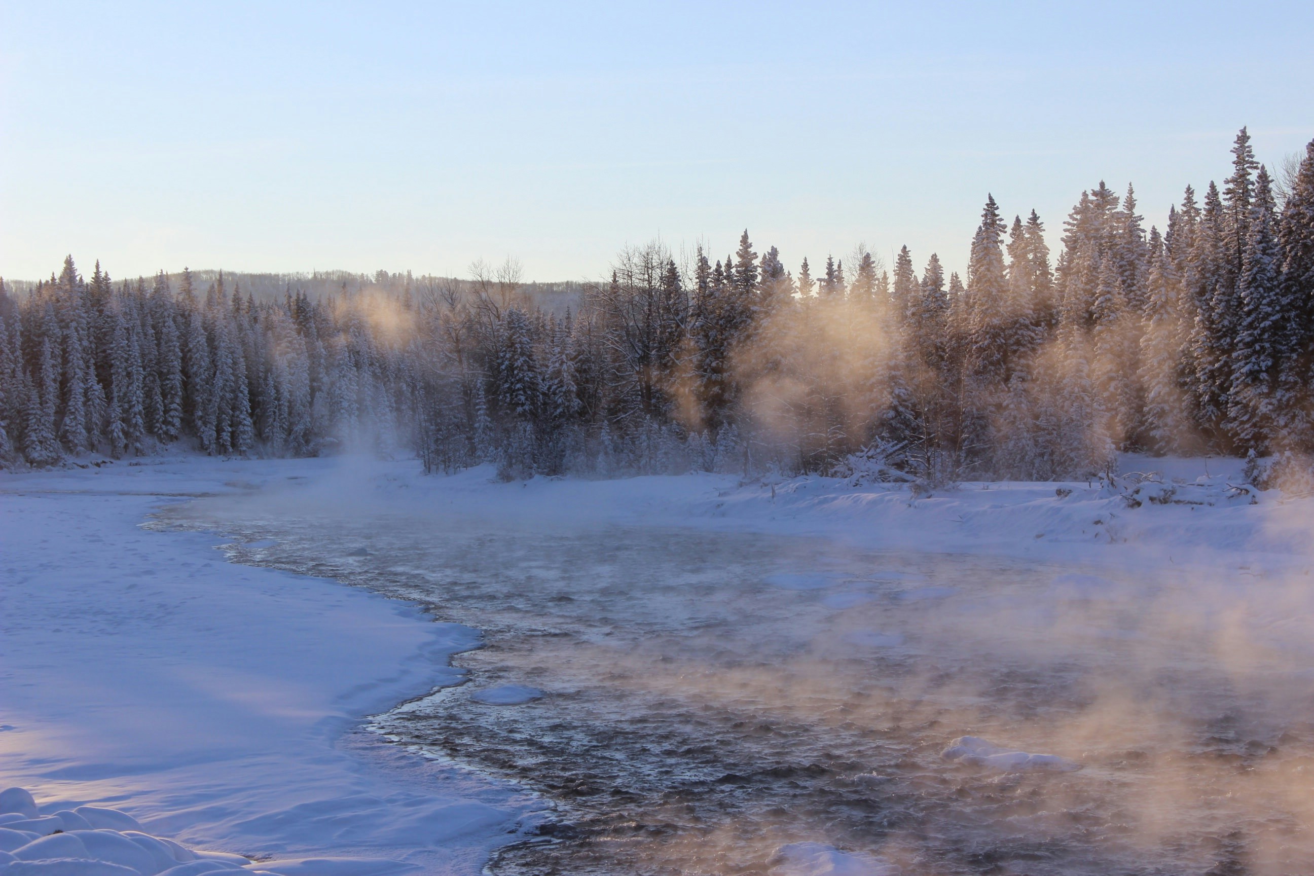1. Snow Covered Lake And Pine Trees Photo Chilly Zoom Background