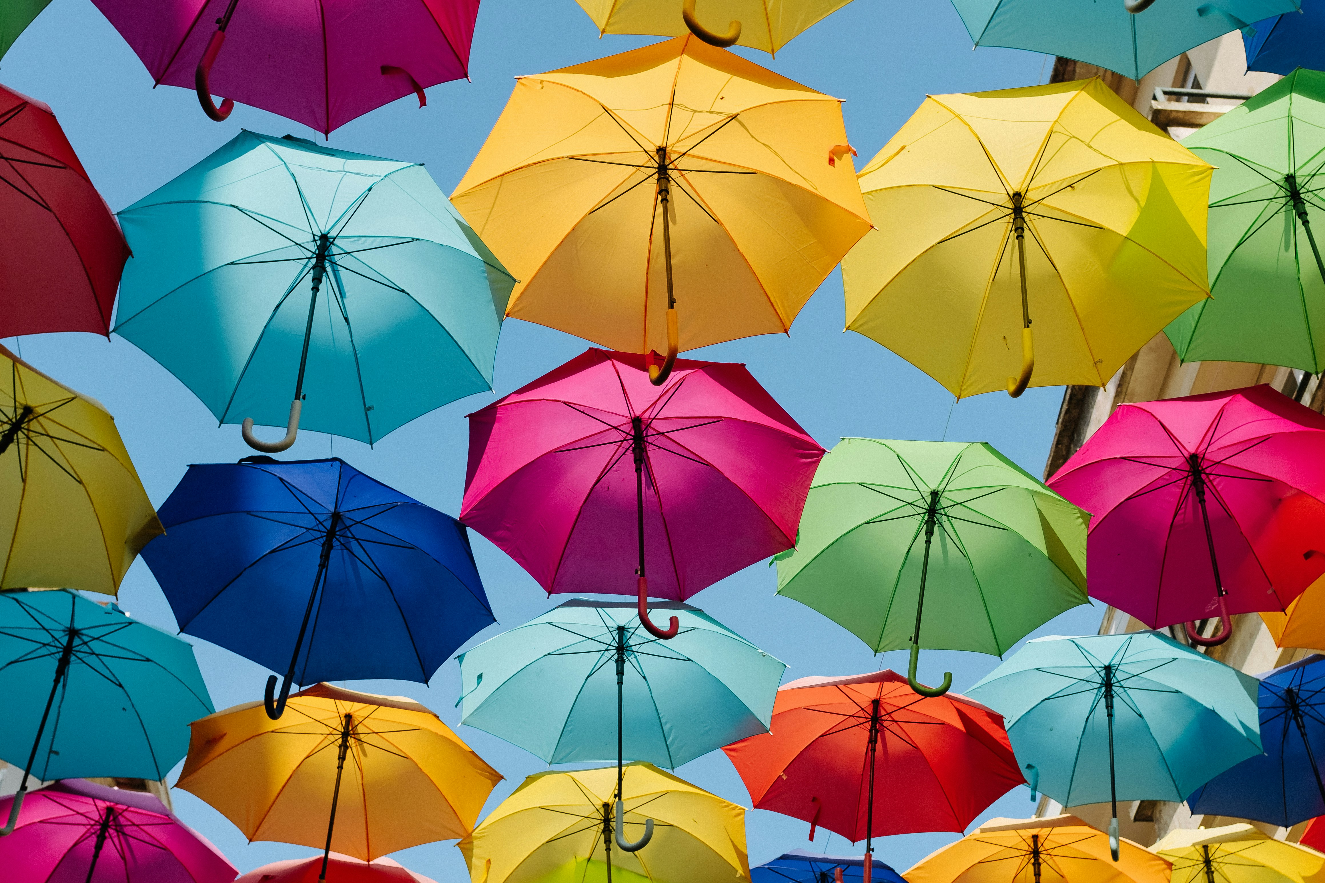 6. Assorted-Color Umbrella Hanging In The Air Colorful Zoom Background