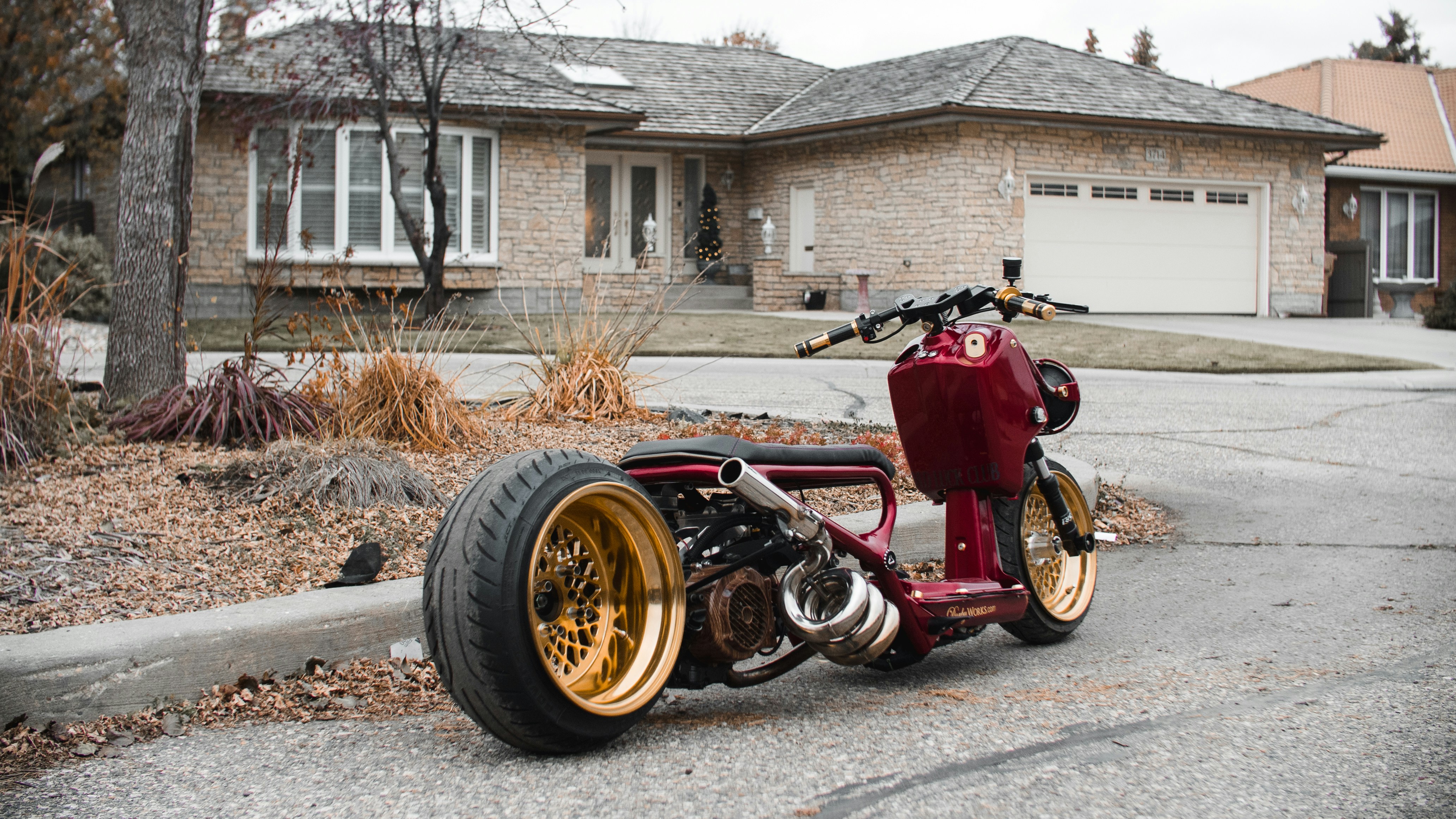 4. Red And Gold Motor Scooter Parked Near Tree Crazy Zoom Background