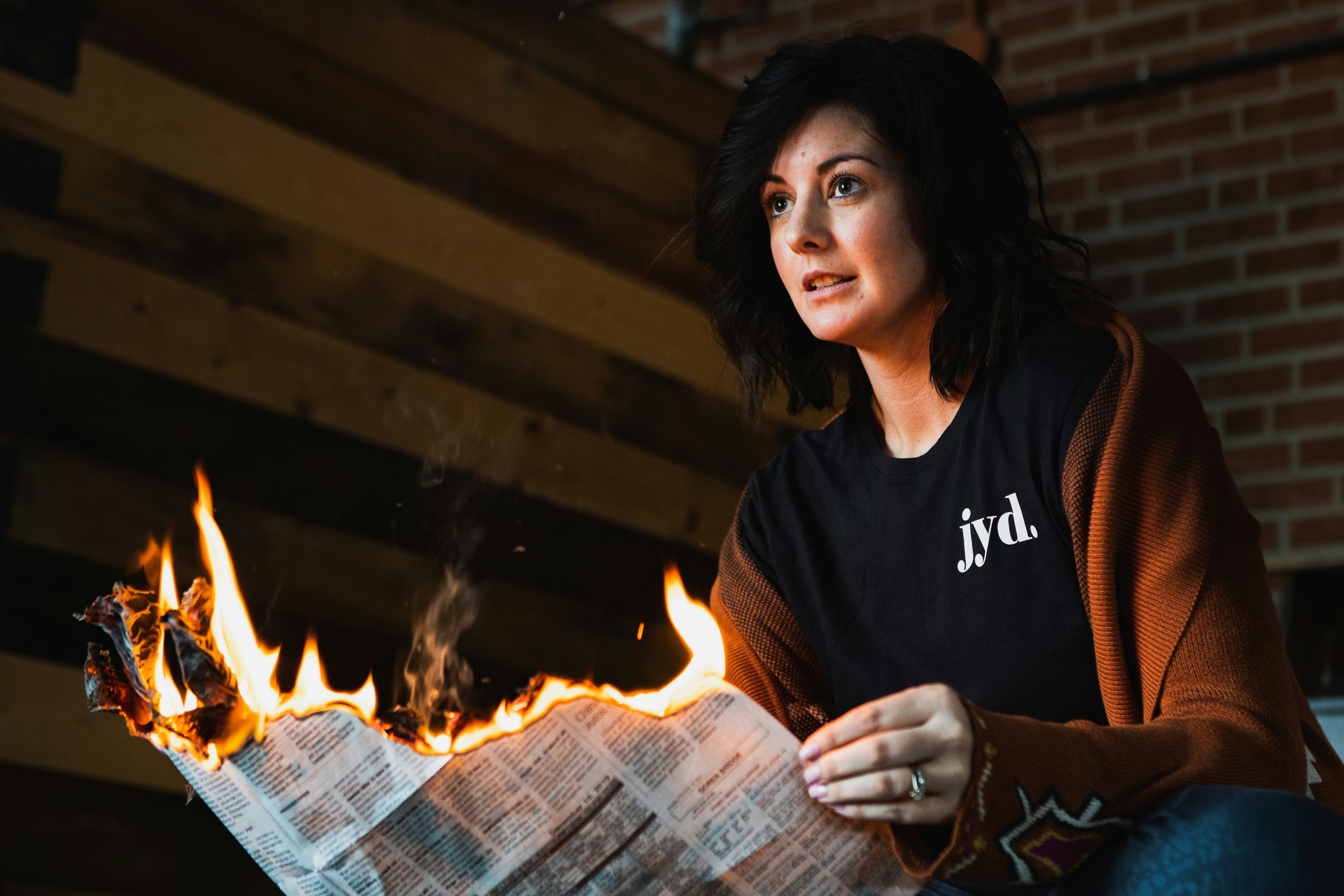 9. Woman Holding Newspaper With Flame Kansas Zoom Background