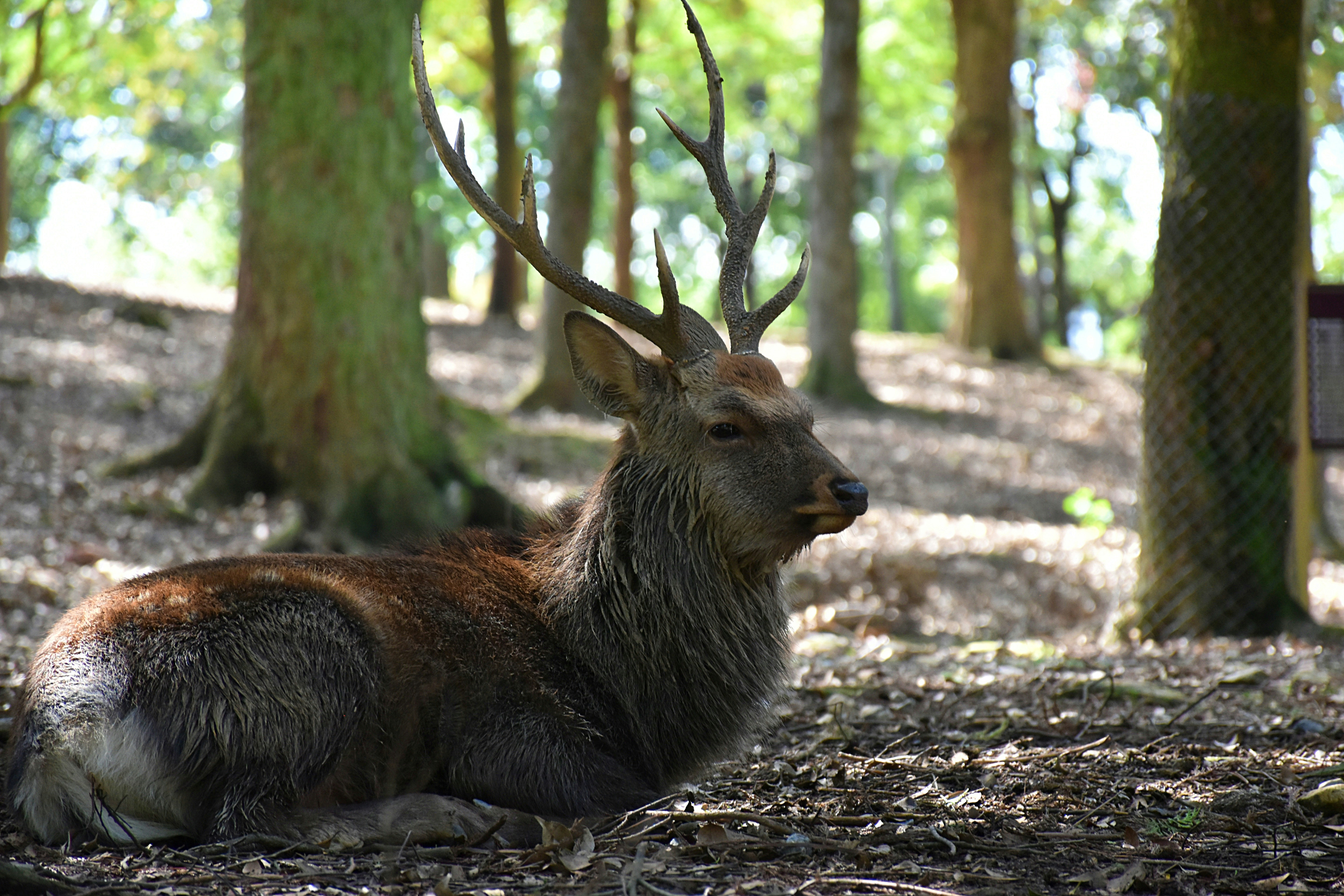 brown deer lying on ground during daytime mammal zoom background
