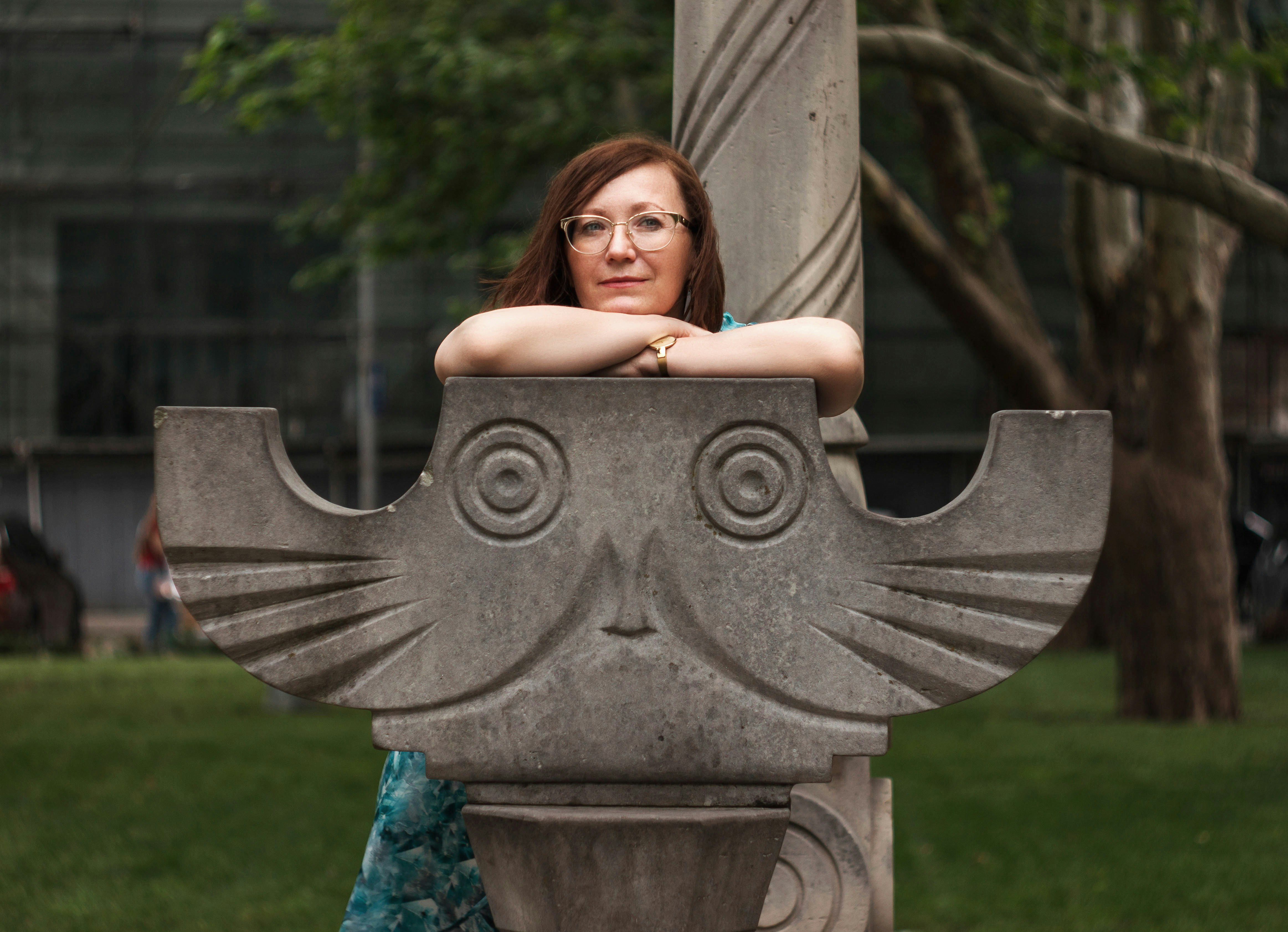 6. Woman Sitting On Concrete Owl Seat Moldova Zoom Background