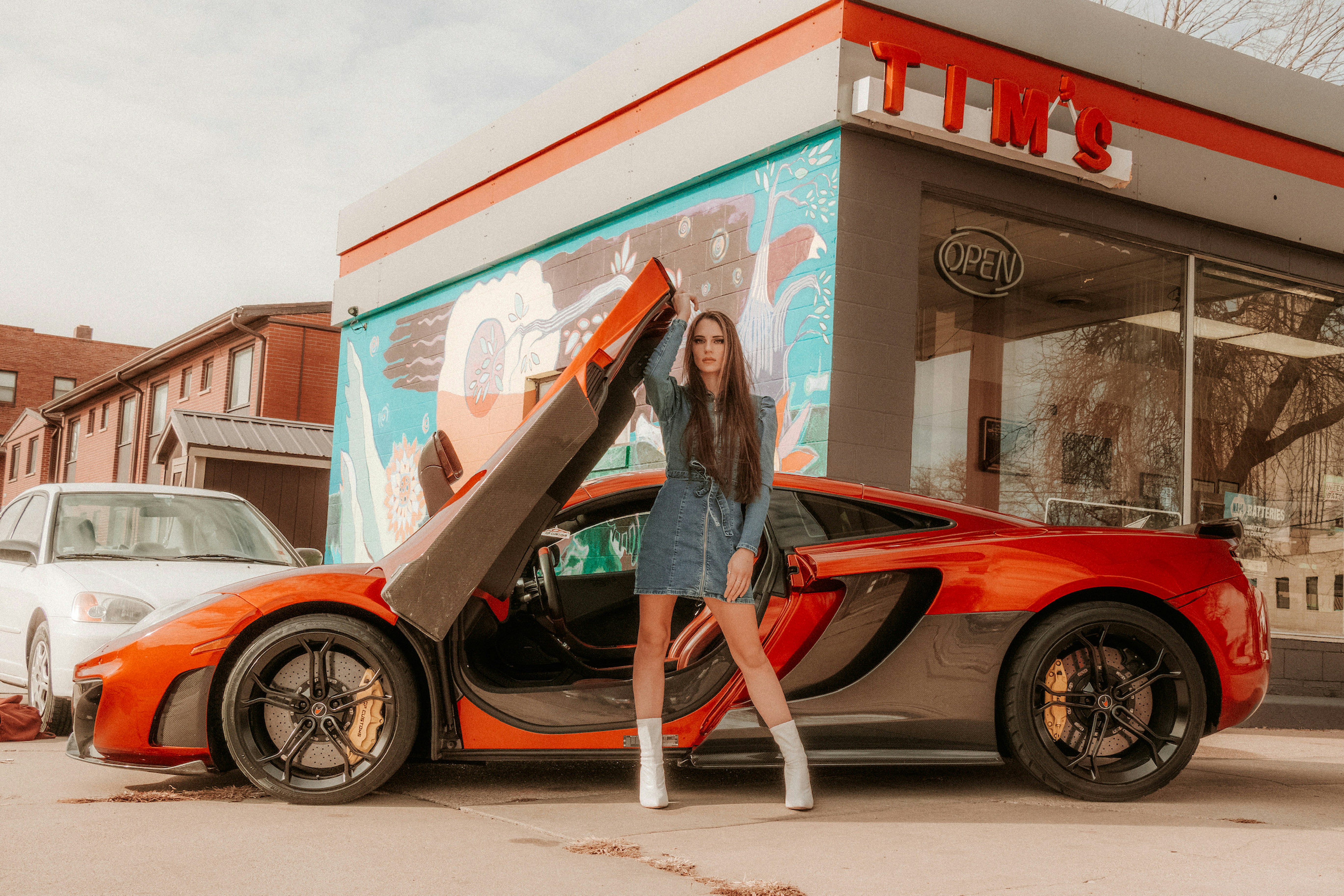 5. Woman In Blue Denim Jacket Leaning On Red Car Nebraska Zoom Background