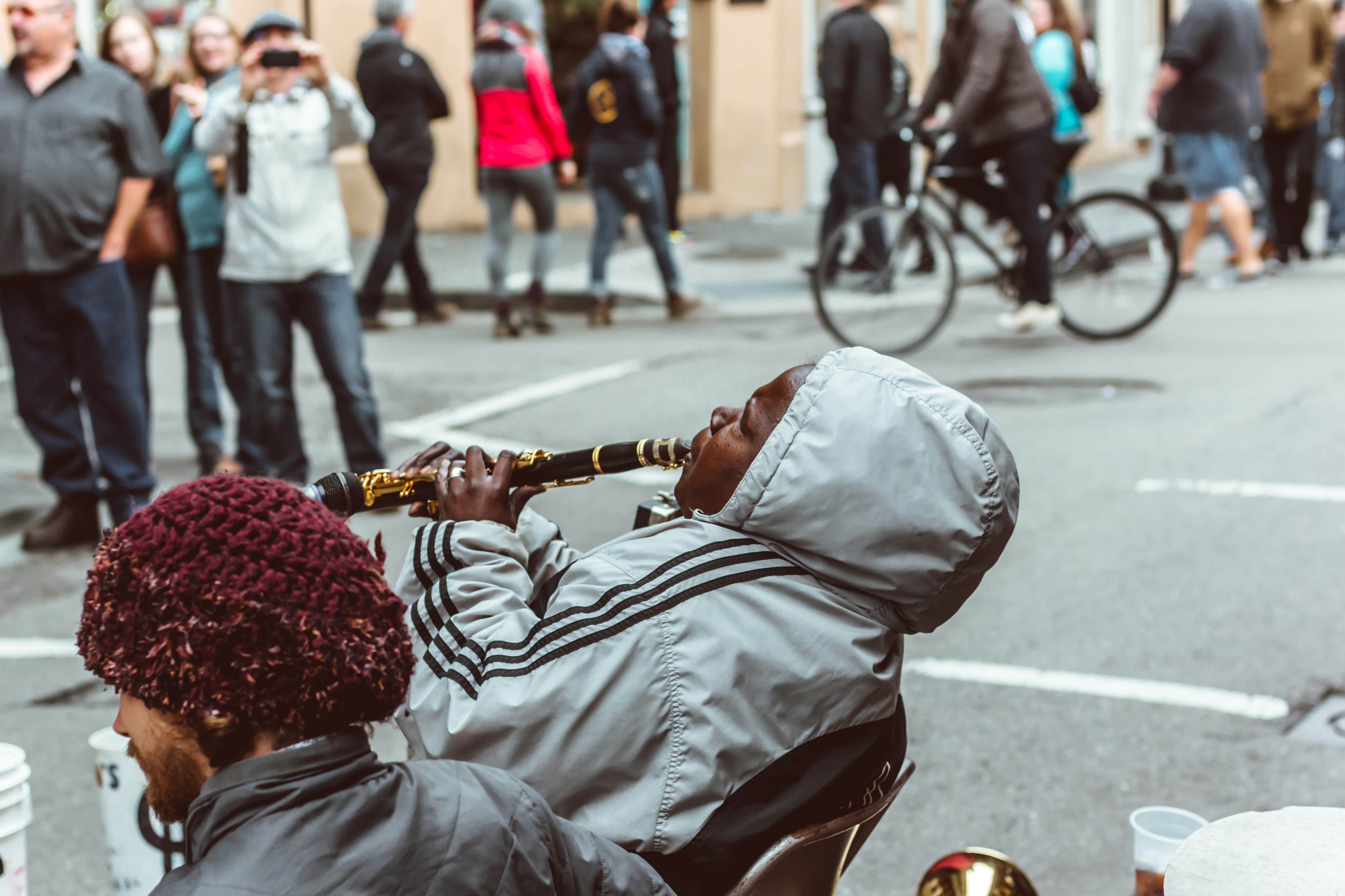 1. People Holding Musical Instruments While Standing On Street During Nighttime New Orleans Zoom Background