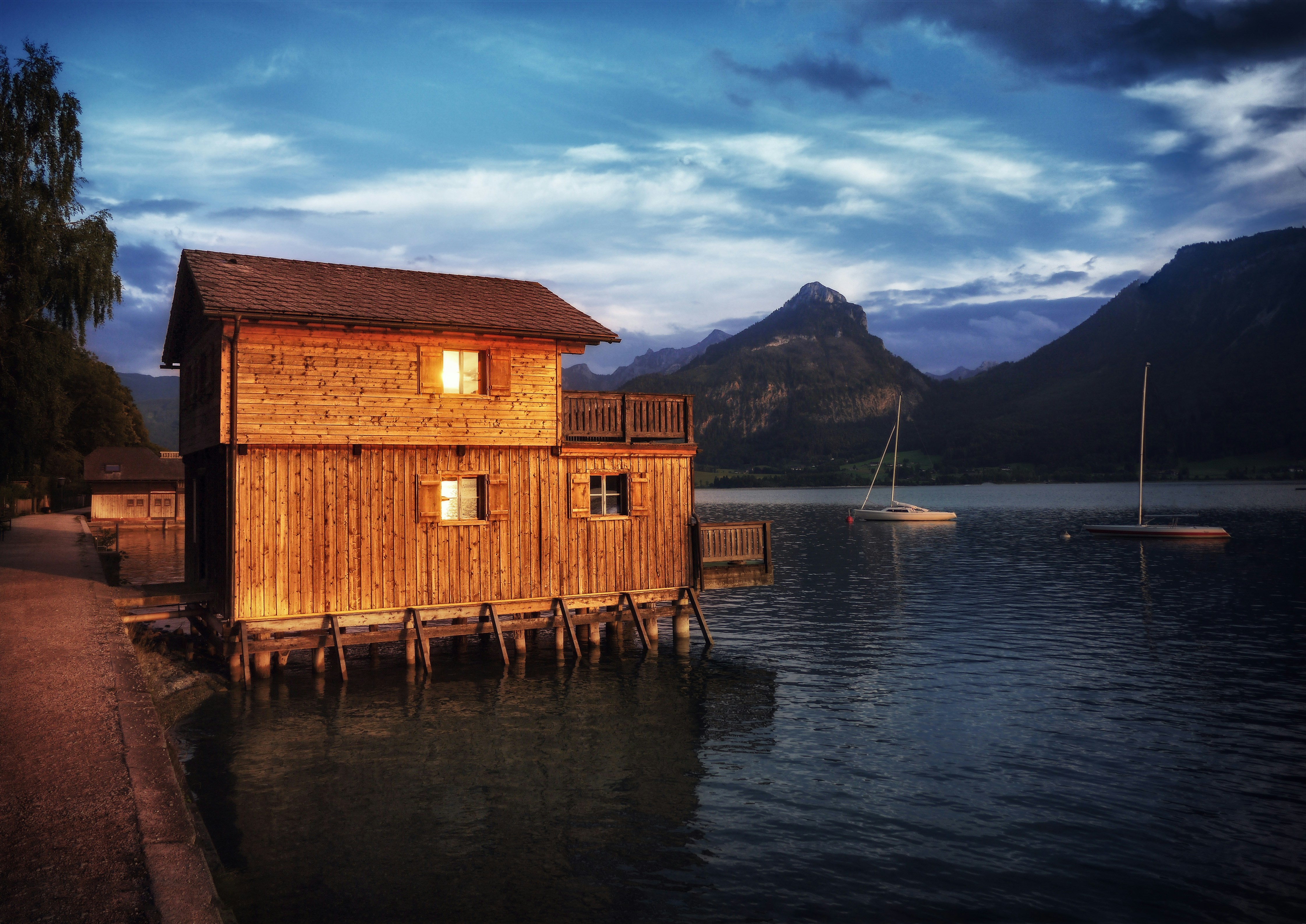 9. Brown And White House Beside Body Of Water Covered With Shadow Of Mountain Oberösterreich Zoom Background